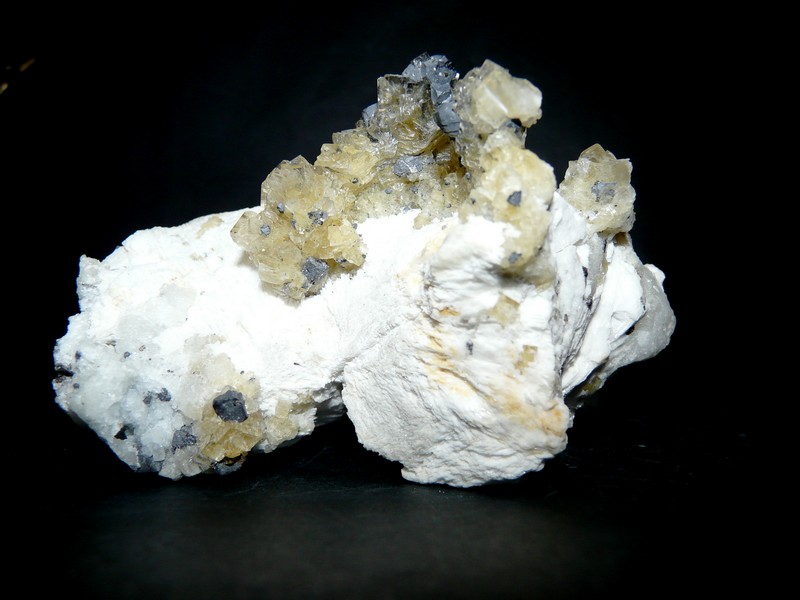 Il s'agit d'un socle de barytine, duquel sortent des stalagtites de fluorite, qui portent au bout des cubes de galène. Assez original pour le gisement. Voyez vous mêmes !!!