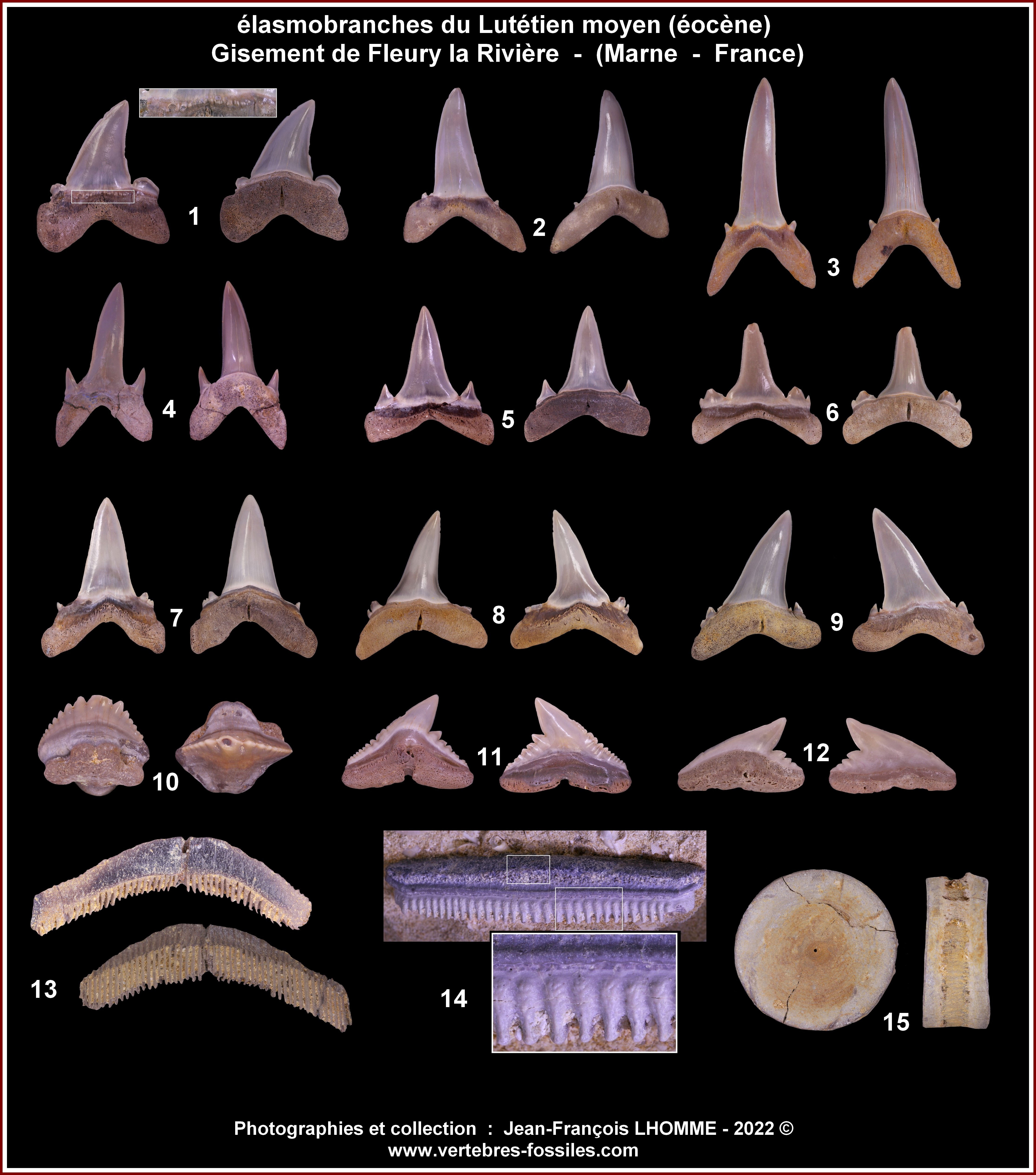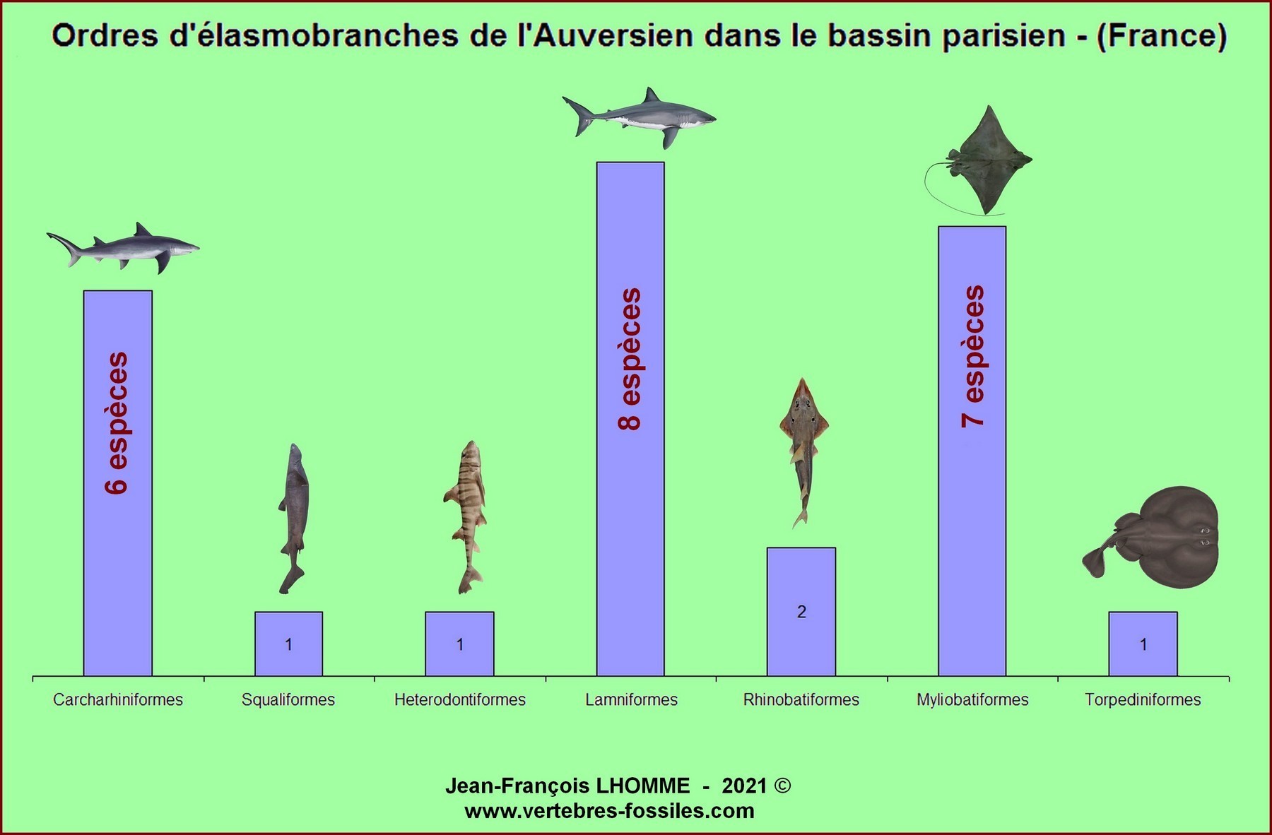 Toutes ces constations m'ont également permis d'analyser les contenus fauniques, des élasmobranches, par ordres, par familles, et par périodes géologiques et de les croiser avec les connaissances au niveau d'autres bassin sédimentaires bien connus.