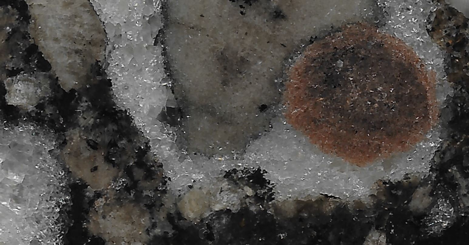 Sur cet extrait de ta photo, on a, en bas à gauche; la titanite en rouge orangé; en blanc, comme du sucre, l'apatite; et une forme ovoïde cerclée de noir ( le pyroxène?) composée de ...