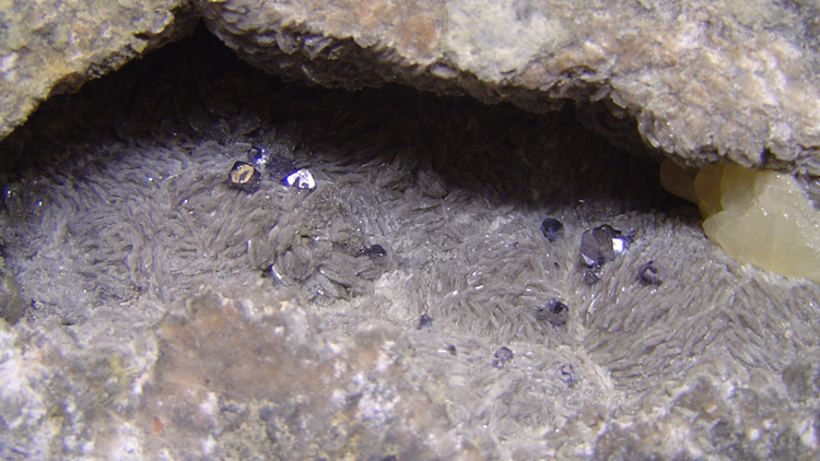 Il s'agit de cristaux dans une geode de barite grise de 10 cm de large (la géode, pas les cristaux ! ).