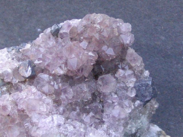 Galène sur cristaux de quartz améthyste, Bégard, Côtes-d'Armor (22), Bretagne.