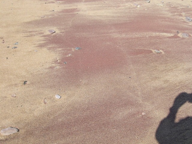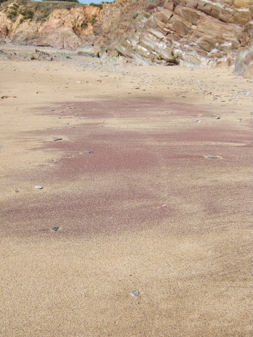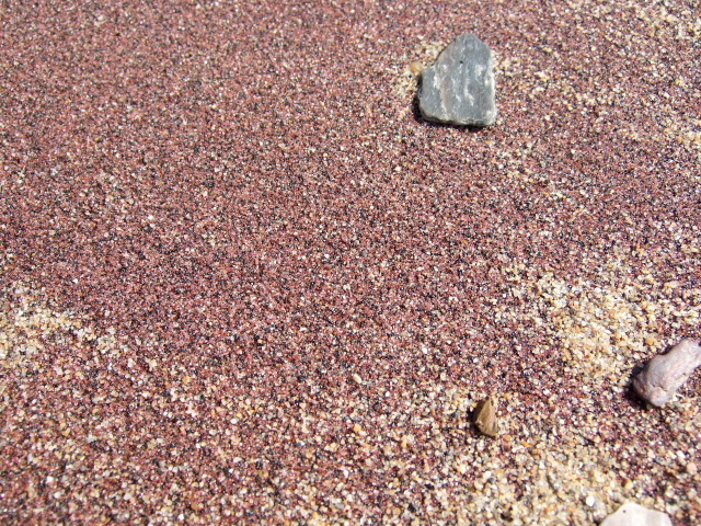 La mer a si bien travaillé qu'elle a trié en surface les sables lourds (dont surtout les grenats d'où la couleur) :sourire: