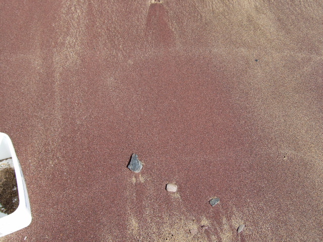 Un peu de ton sable de plage rouge contre un cailloux ???