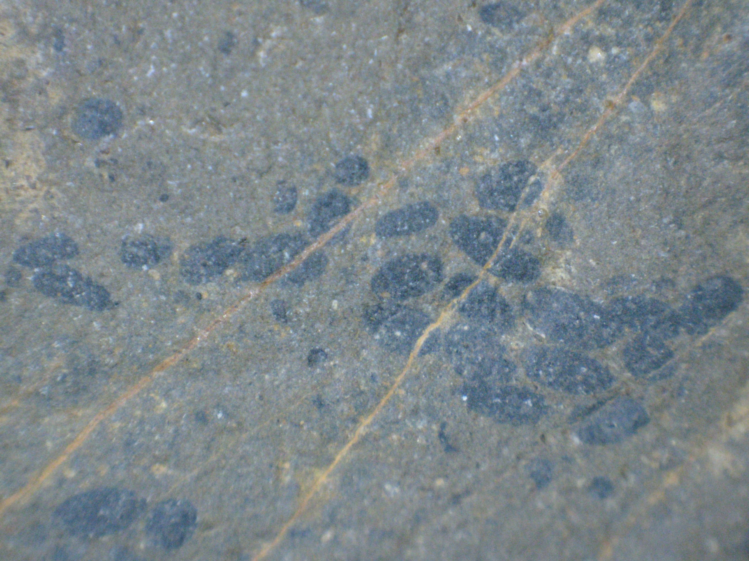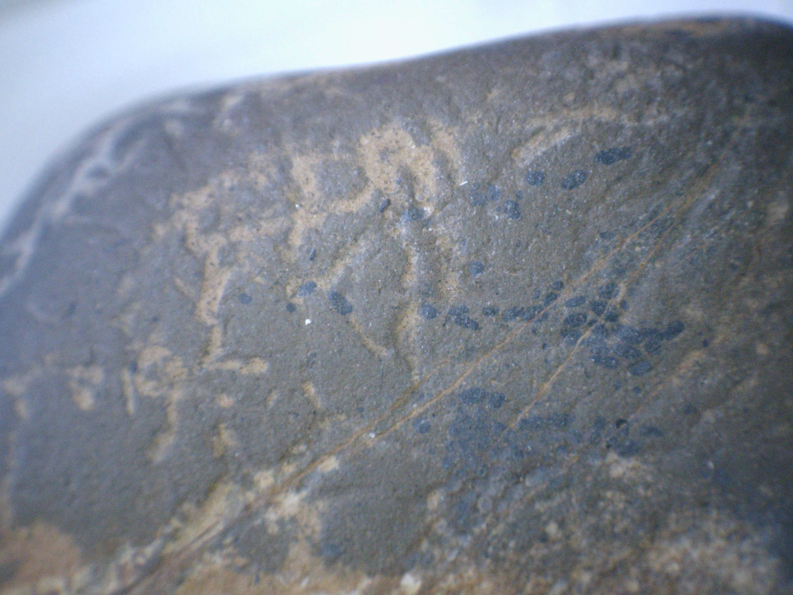 ce petit galet du Rhin montre l'association de terriers de vers (?) et de coprolithes qui pourraient provenir du même animal. Certains de ces coprolithes sont (apparemment) inclus dans des terriers. Les terriers de ce type sont assez courants dans ces lydiennes du dévonien, mais les amas de coprolithes, comparables aux Tomaculum problematicum de l'ordovicien, sont nettement plus rares.