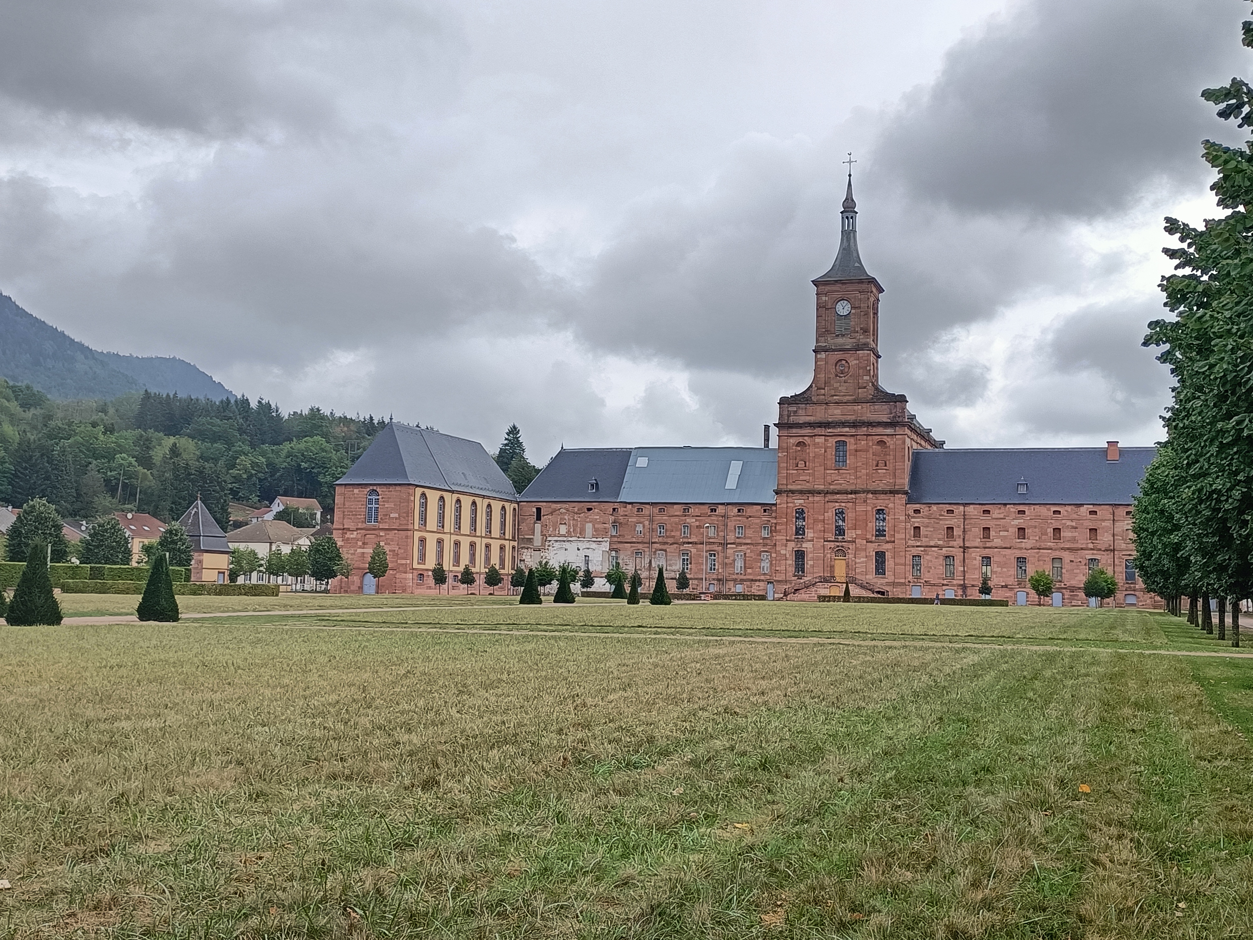 Abbaye de Moyenmoutier, transformée en usine textile,comme celle de Senones par la même famille,le cloître fut rasé pour installer des machines et le parc des bâtiments d'usines .Grés des vosges , 4 )formé par des particules d' érosion transportées par le vent,3) trace d 'argile les vides,et cailloux par le transport de l 'eau,5) traces de gouttes d'eau lors de la formation du grés.