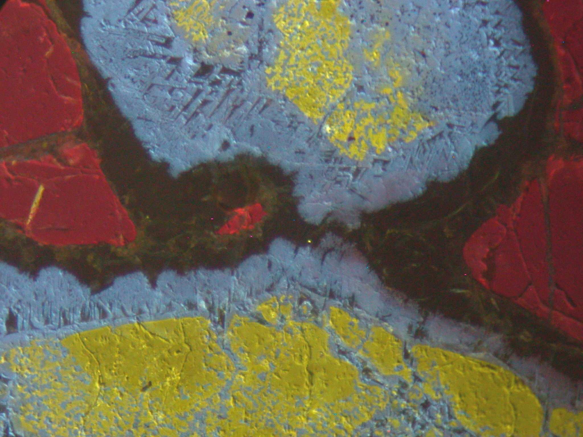 Dans la parte grenue/fondue, en cathodoluminescence, le rouge grenat correspond au quartz, le verre apparait en noir, le jaune franc est du plagioclase qui n'a pas fondu, le bleu mité de jaune est du feldspath K qui a souffert, mais pas fondu, et le bleu vif correspond au liquide de fusion qui a recristallisé.