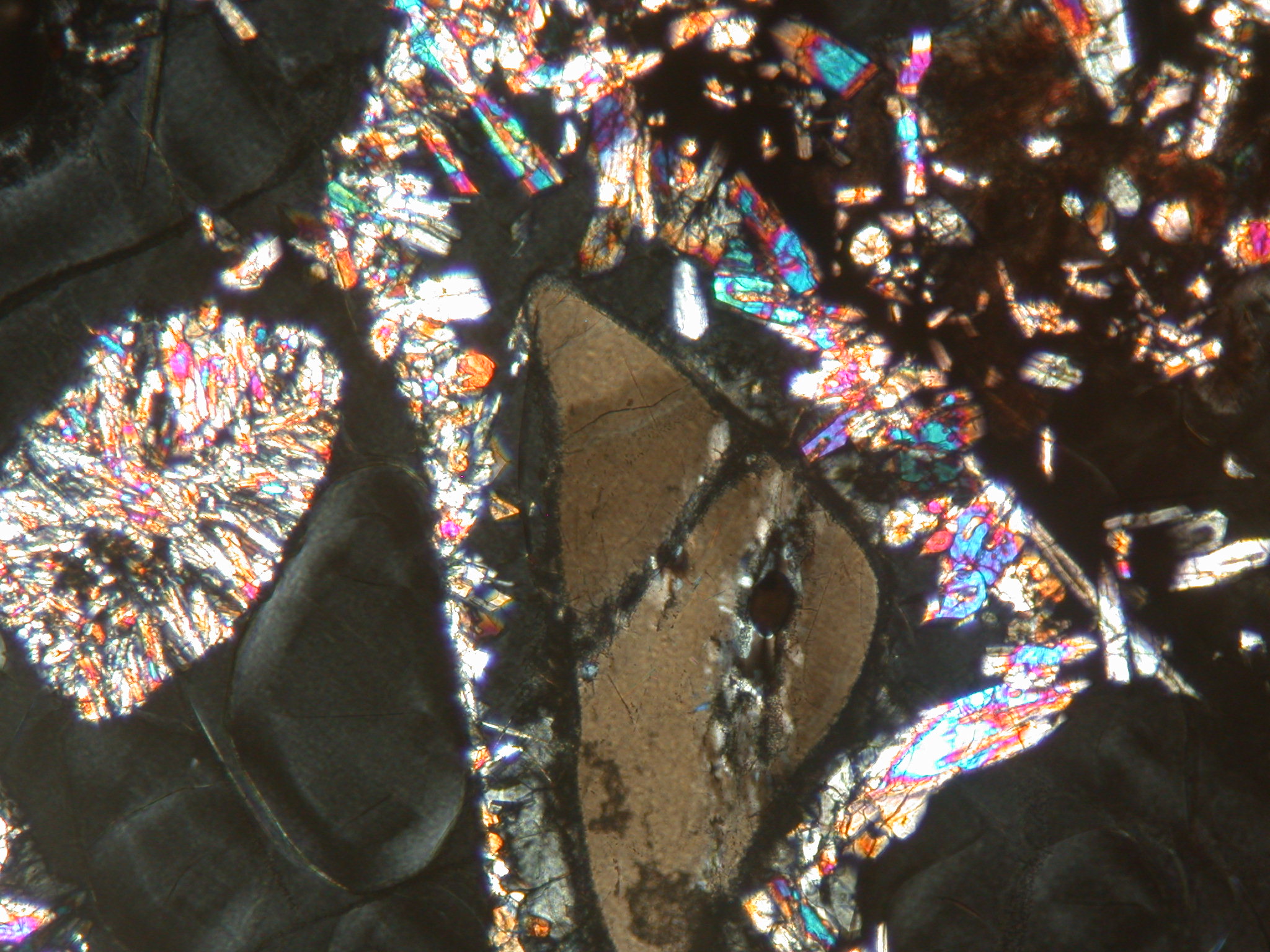 Depuis le basalte dans le coin en bas à gauche jusqu'au quartz (dans un triste état) on passe par une bande sombre, riche en verre puis à la couronne de Px avec d'abord des petits cristaux puis de plus grands baignant dans du verre. Ceci image probablement la compétition nucléation/croissance sous contrôle du gradient de refroidissement et de la surfusion.