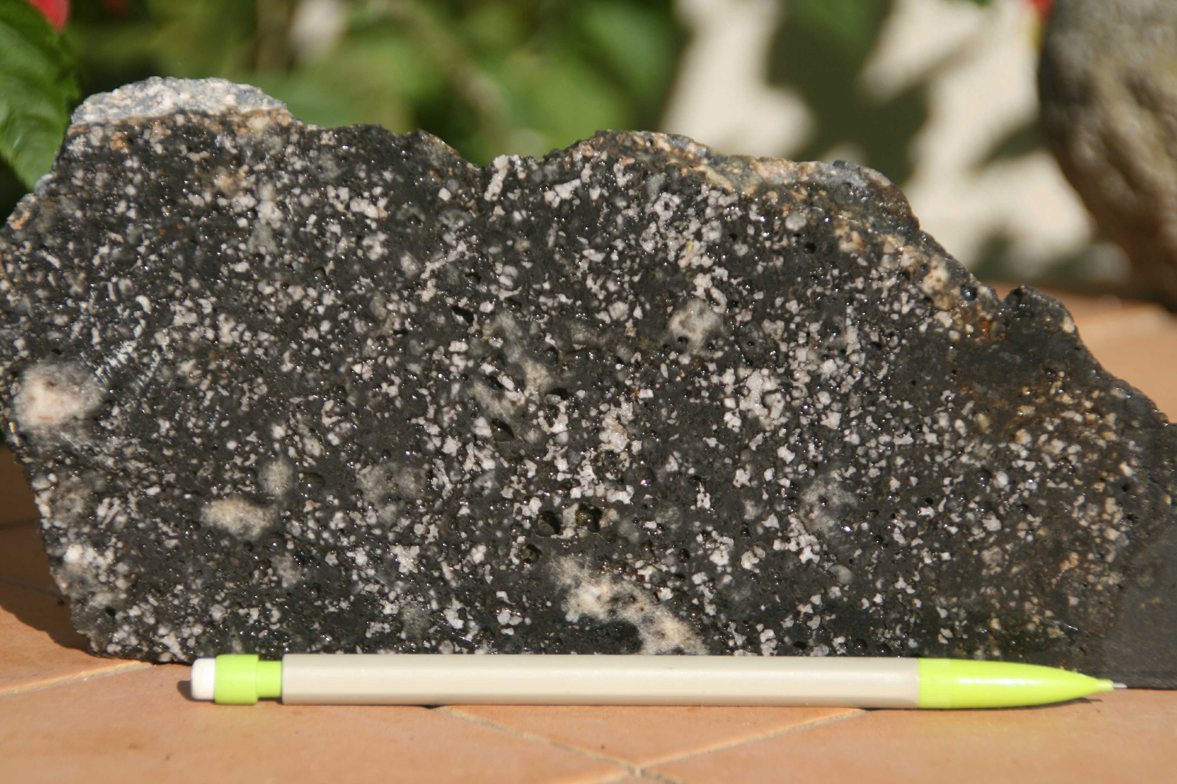 Si vous avez repéré la partie grise à la pointe du stylo, vous avez certainement compris qu'il s'agissait d'une enclave (xénolithe) dans un basalte.