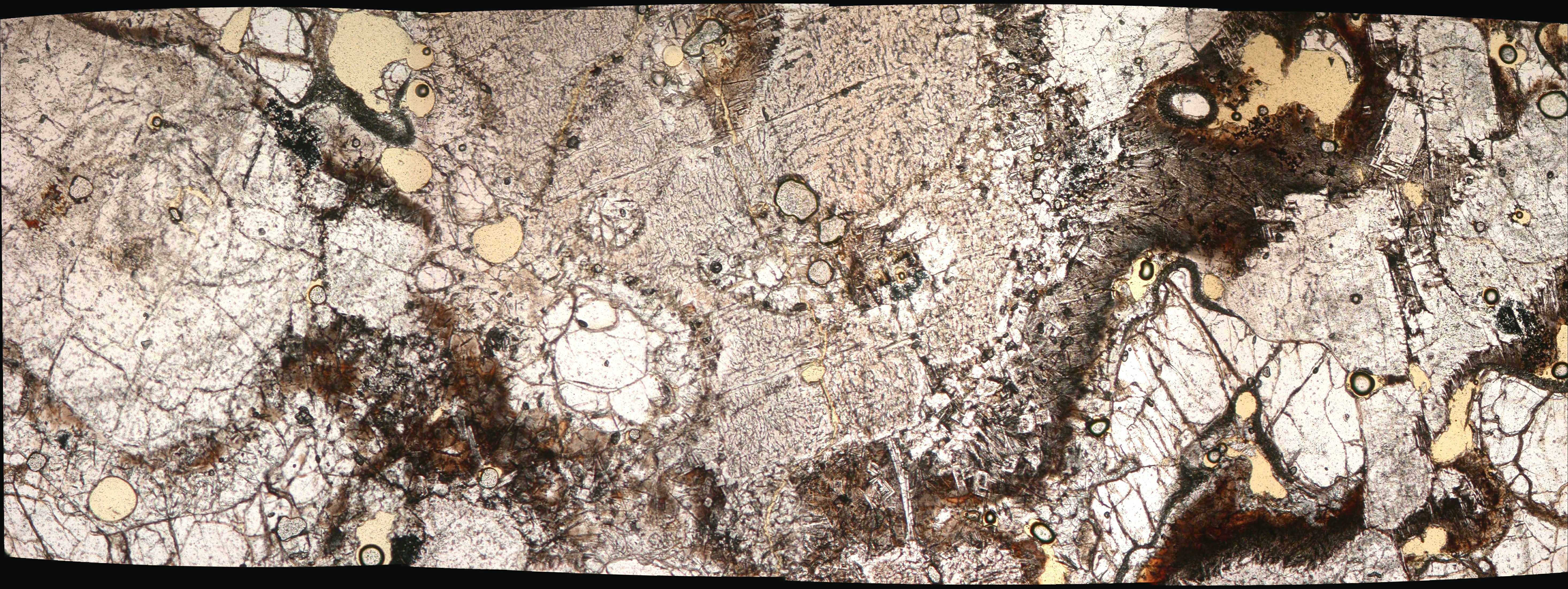 Voici une grande coupe reconstituée sur la largeur de la lame mince : le basalte est a droite, le cœur de l'enclave à gauche.
