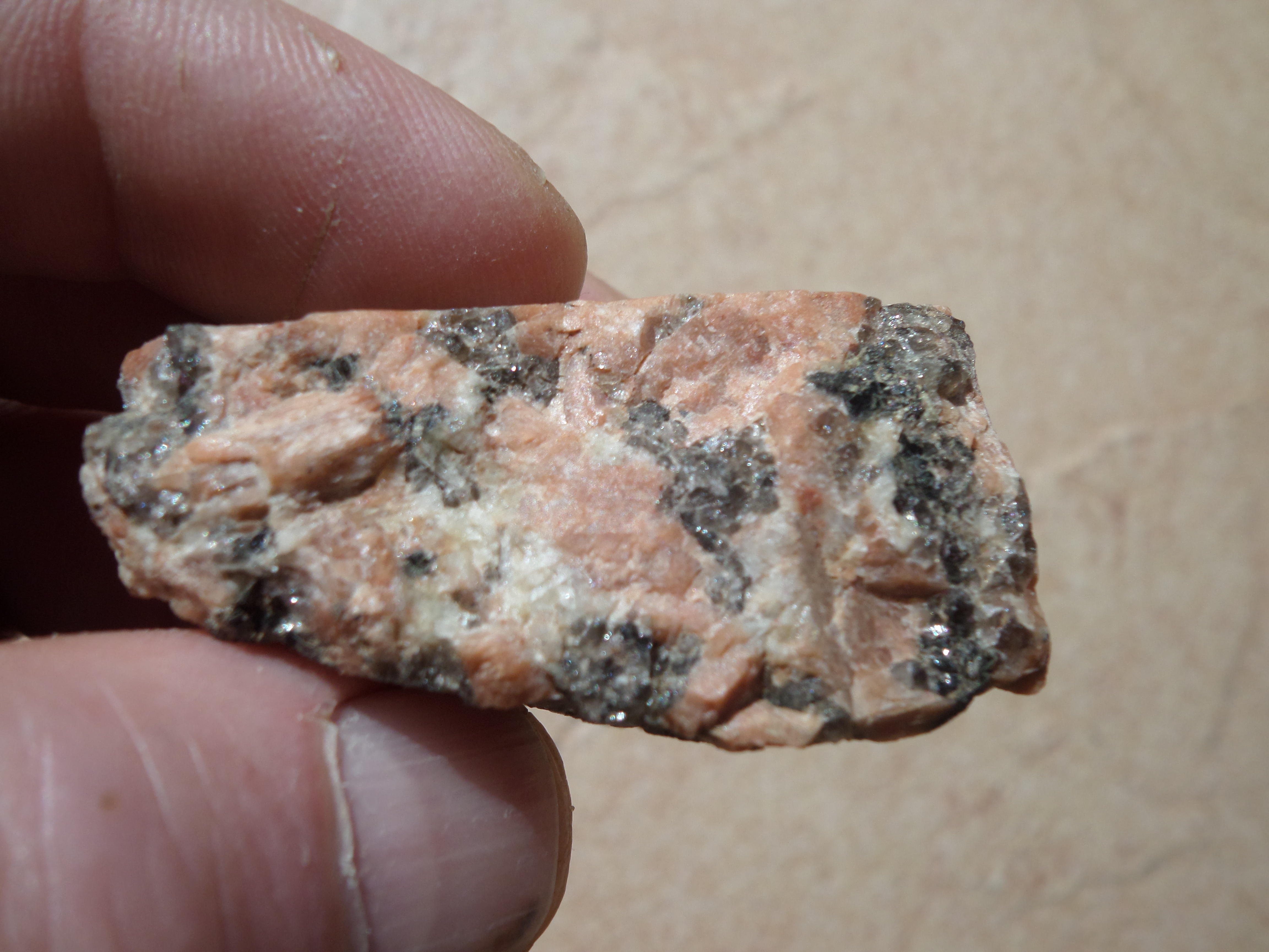 Bonjour,sur une publication j 'ai une roche qui ressemble,notée"migmatite diatexite, fond ,quartzo feldspathique ( blanc et orange) cordiérite( grise.) Mais elle ressemble aussi à Pegmatite😵