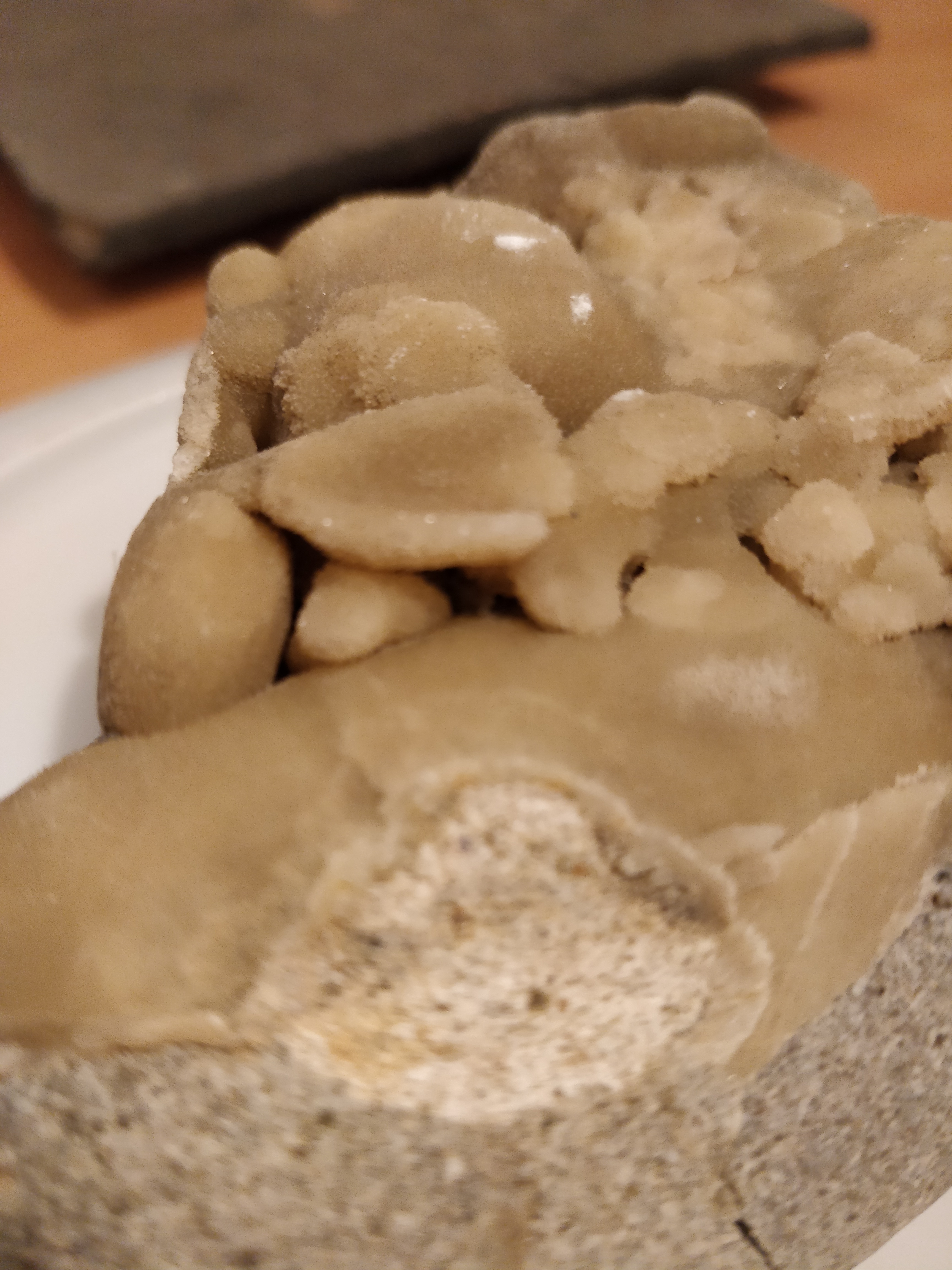 A certain endroit le dépôt forme des "pétales" un peu plus épaisses et qui laissent un peu passer la lumière quand j'approche une lampe (voir gros plan).