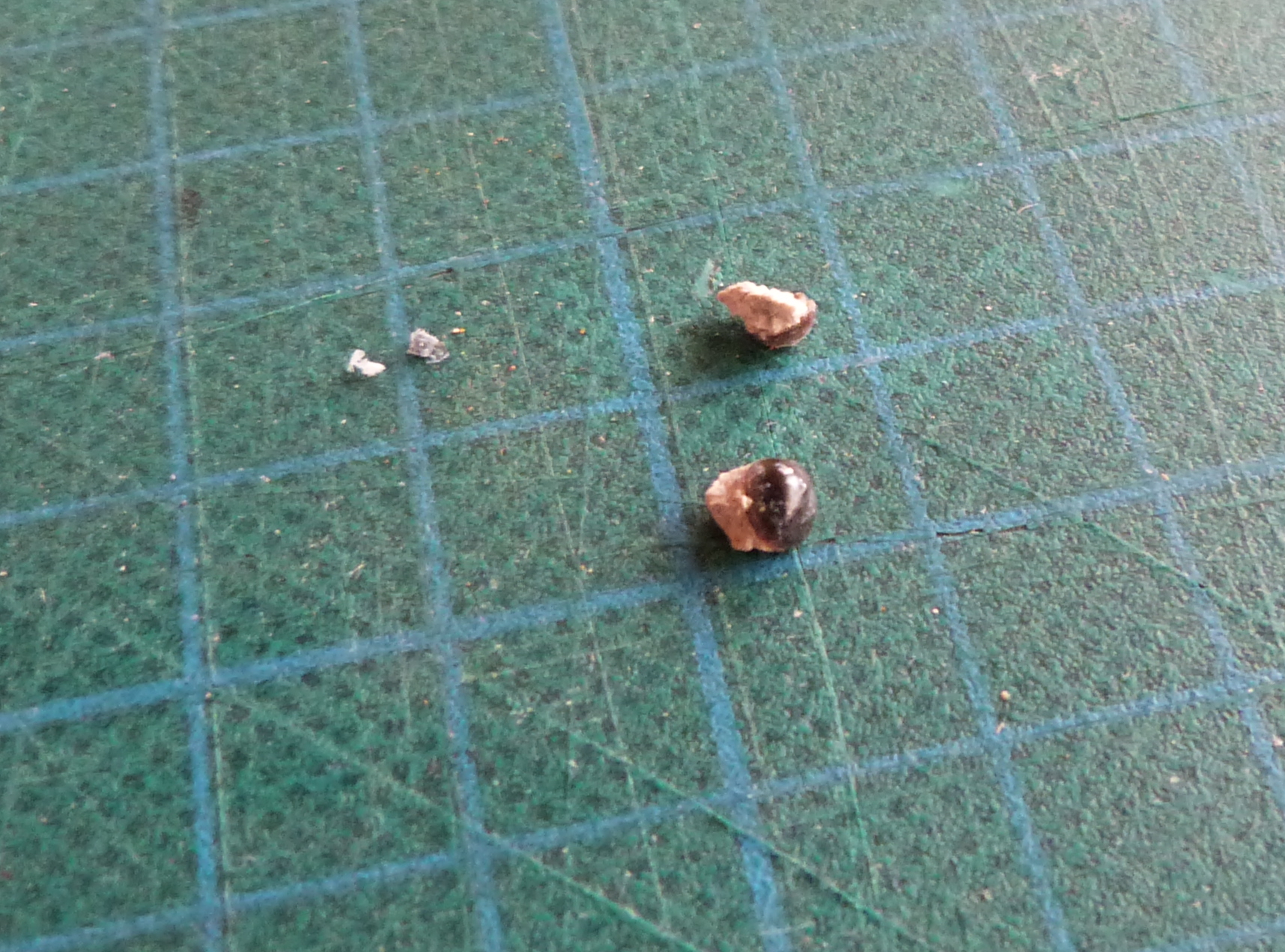 - objet ressemblant à une petite côte ou une dent de rongeur, présence d'une enveloppe brune translucide