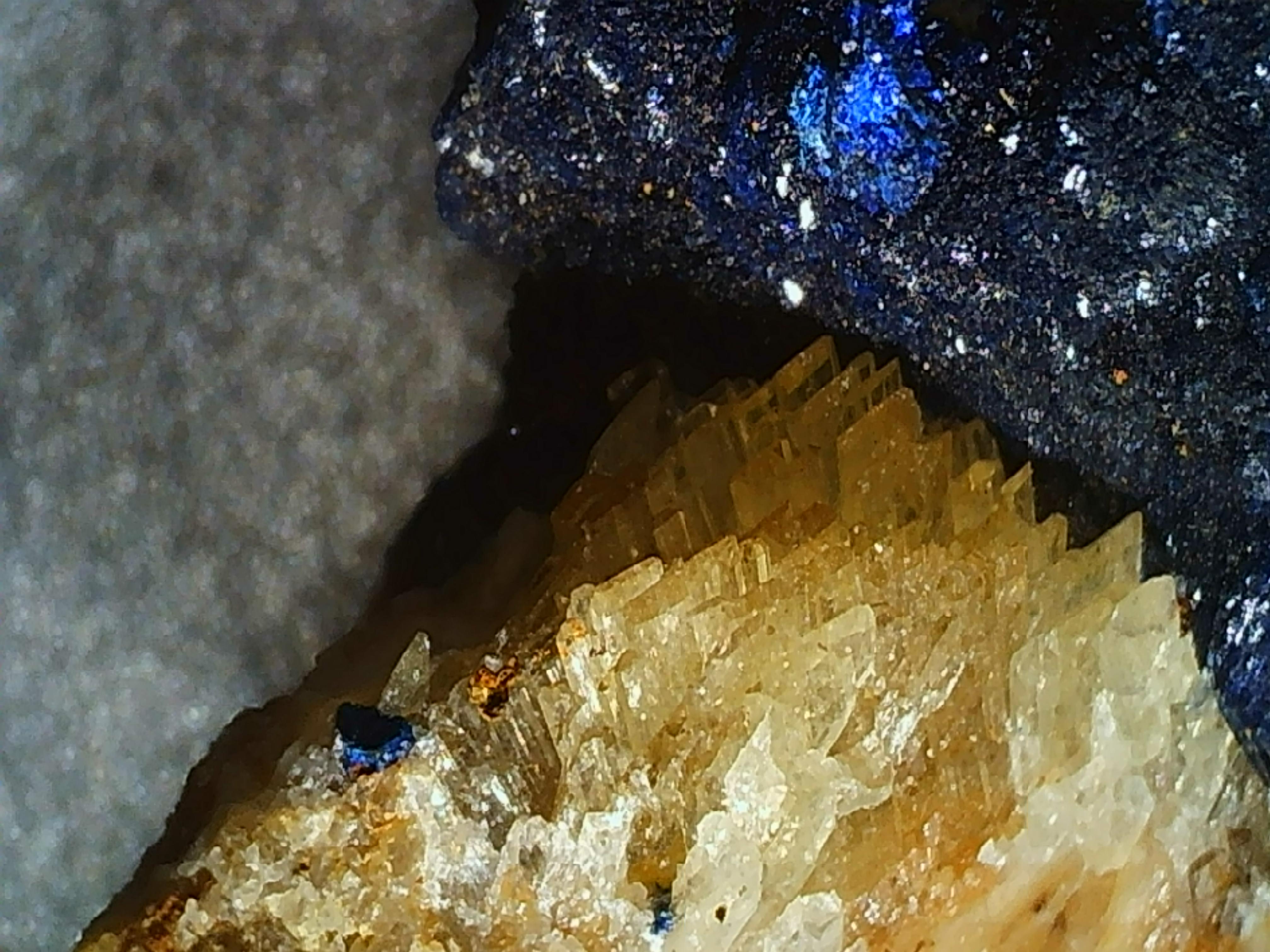 Tout d'abord, "section" azurite . Un petit spécimen qui se retrouve bordé d'un éventail de cristaux tabulaires biseautés à leurs extrémités. Sur le coup me suit dit baryte. Provenance d'une ancienne mine gallo-romaine où le cuivre y était exploité ainsi qu'un peu de baryte.