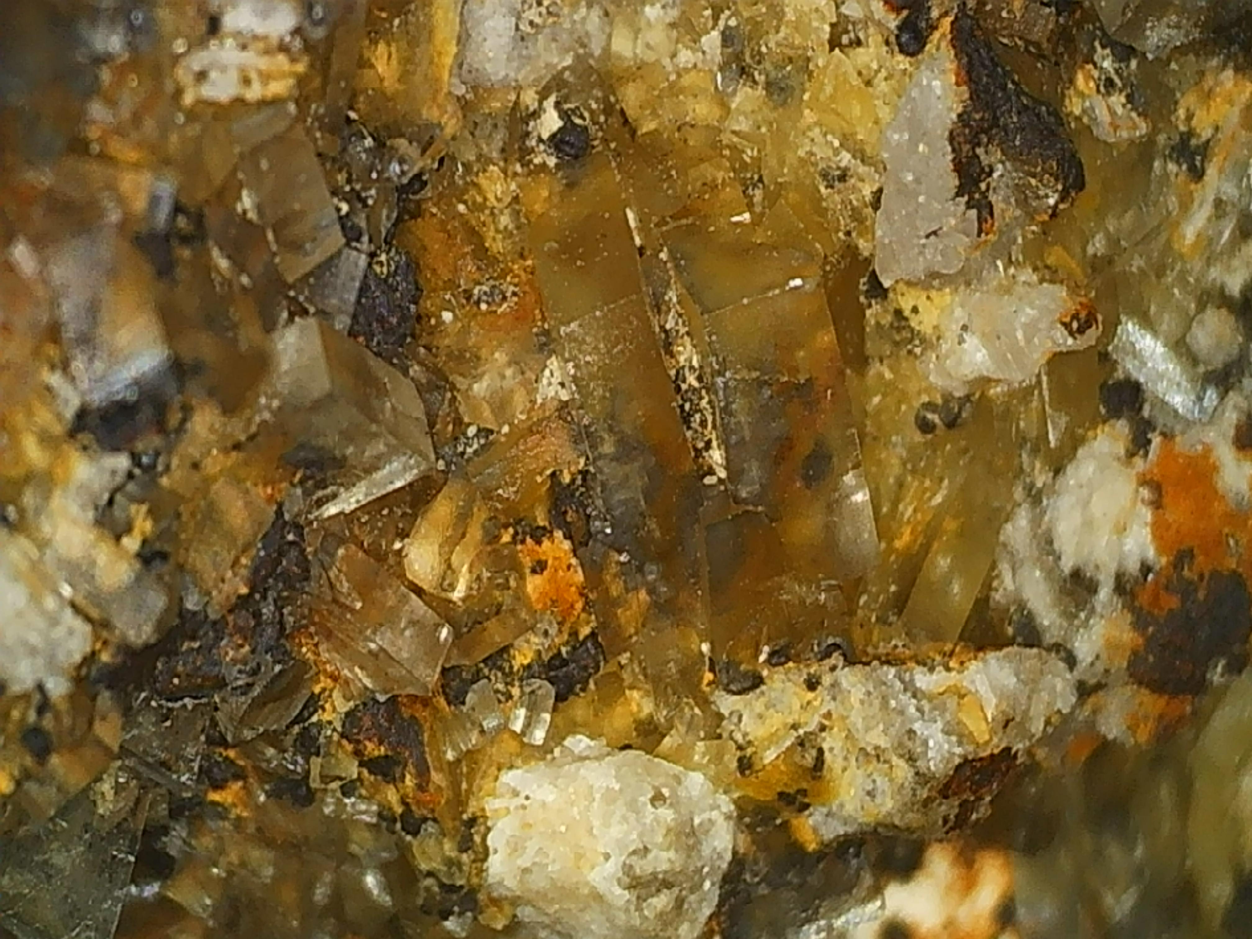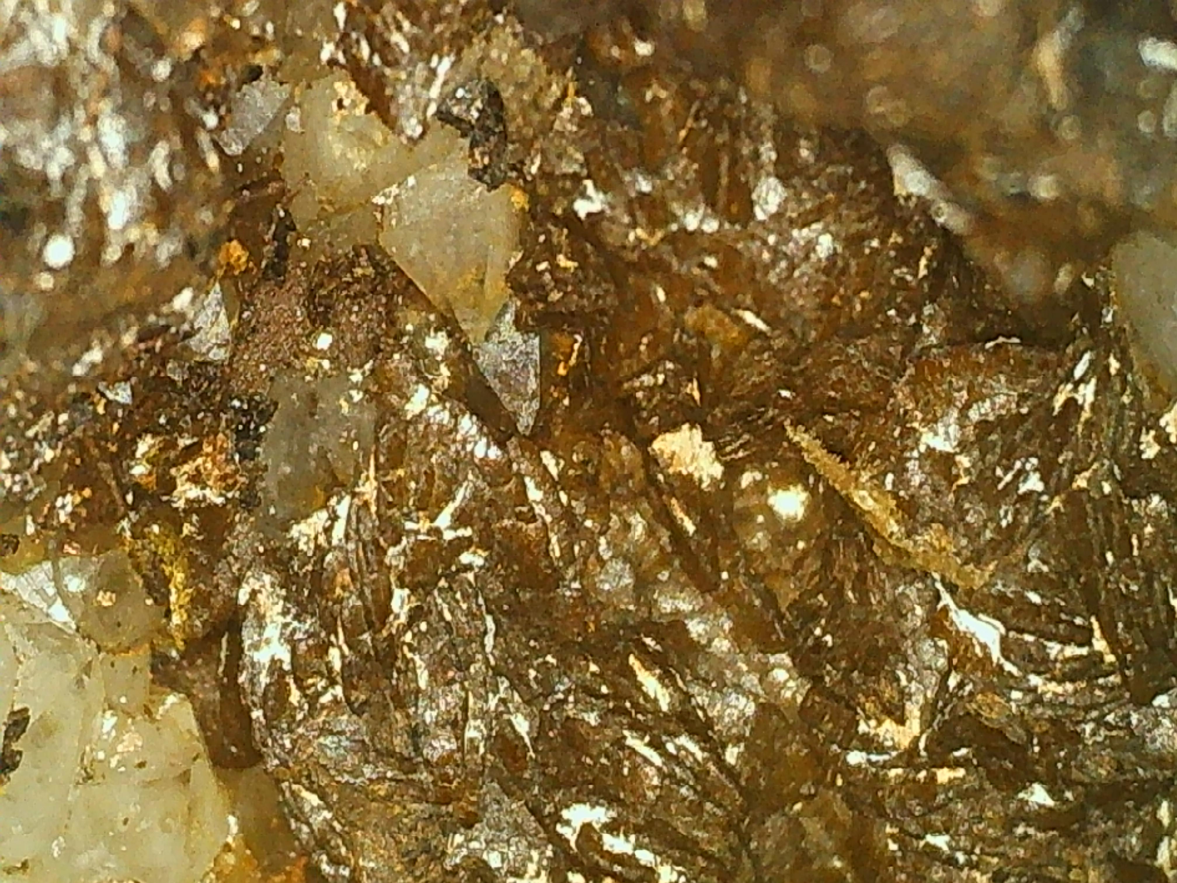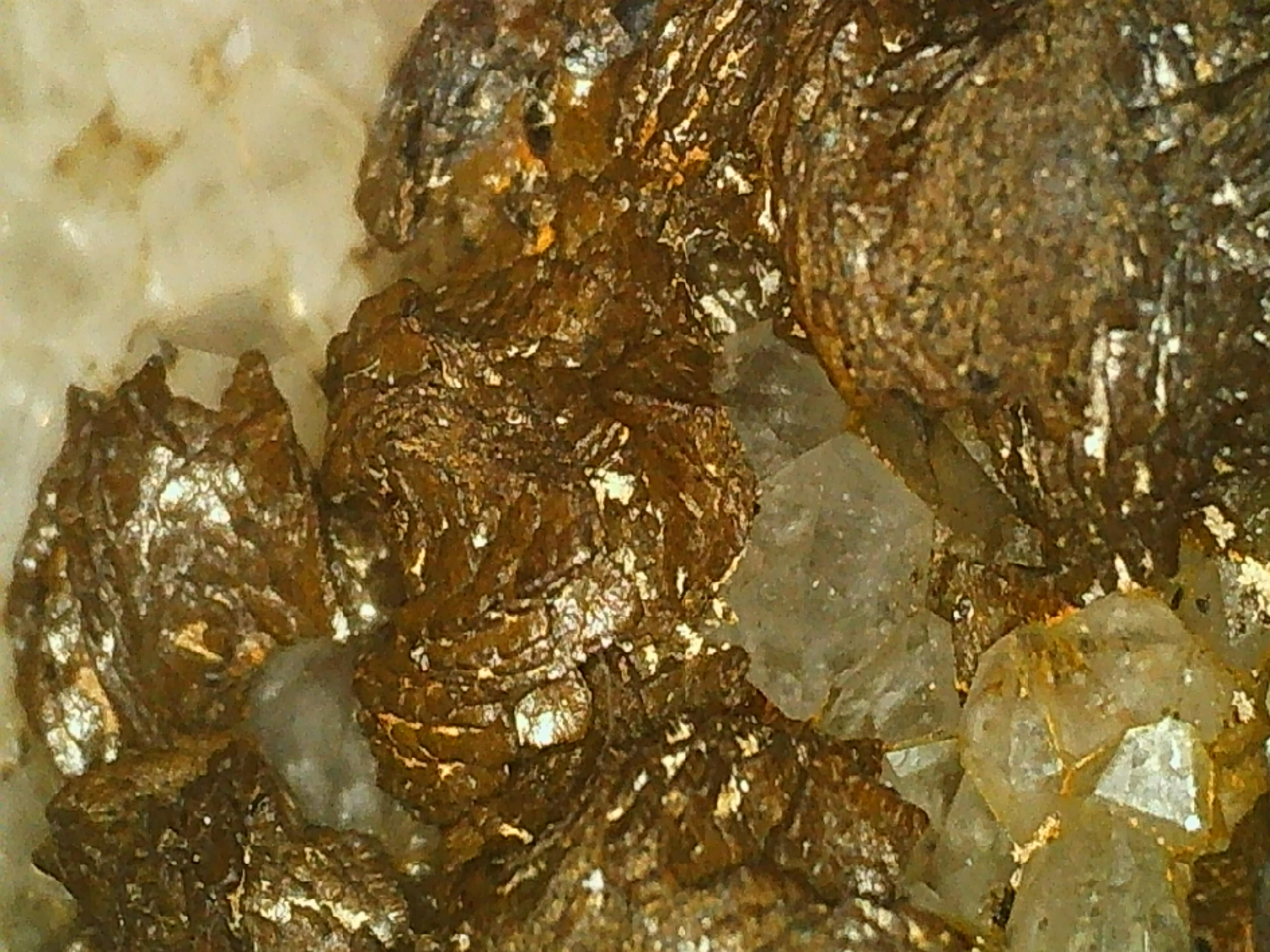 Au retour d'une mine bien connue en Aveyron le weekend dernier , j'ai retrouvé dans mes trouvailles une gangue (granite,schistes/feldspath ?) recouverte de cristaux de quartz ainsi que d'une drôle de minéralisation marron foncée...