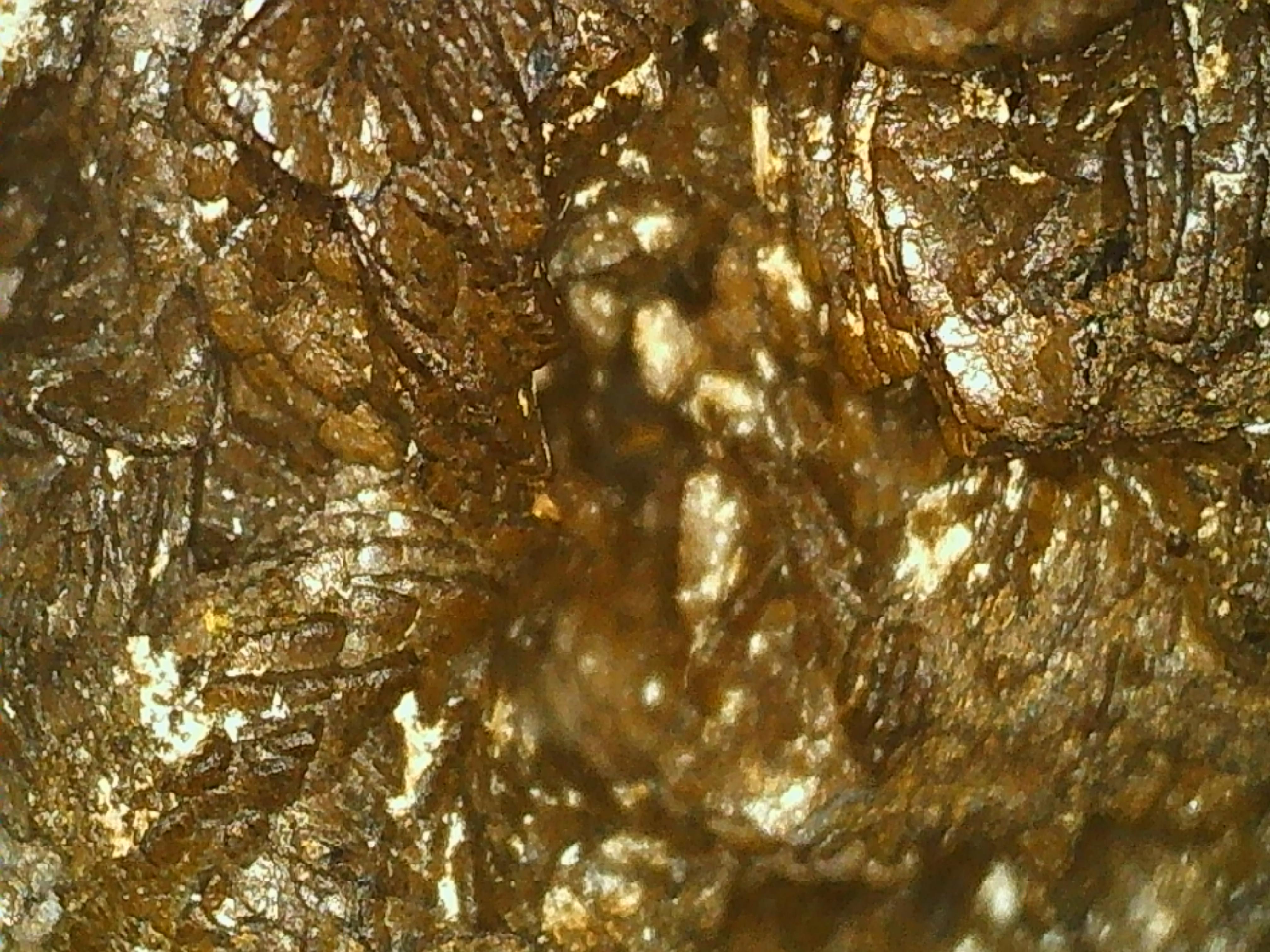 Et qqls vidéos, qui devraient mieux rendre compte de ces cristallisations. Sur l'une d'elles on voit l'aiguille rayer aisément la surface de ces "boules" (pour la plupart formées comme par un éventail) marrons. Ce n'est pas de la terre , ni du lichen (😁), ils sont tous bien en place , solidement fixés. Ils sont rayable aussi par le cuivre. Avec l'ongle un soupçon de rayure mais rien de bien concluant. Aucune réaction à l'hci (sur l'instant).