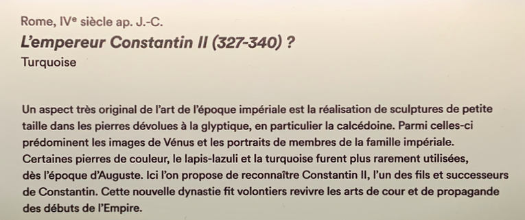 Pour le buste de l'empereur Constantin II, je ne saurais être affirmatif mais il me parait peu probable que Guy Ladrière, antiquaire et expert ayant une certaine compétence et réputation, ait inséré dans l'exposition consacrée à sa collection de glyptique une pièce contemporaine sans intérêt. Il s'est peut-être référé par exemple à d'autres pièces similaires authentifiées par exemple par leur découverte dans le cadre de fouilles archéologiques. L'objet parait certes de facture un peu grossière par rapport à des objets beaucoup plus anciens  comme la Vénus du 1 er siècle ou d'autres objets de la même période conservées à la BNF mais certains savoir-faire se sont perdus au fil des siècles. Il n'y a qu'à comparer par exemple les monnaies impériales romaines à celles du haut moyen-âge: Il n'y a pas photo!