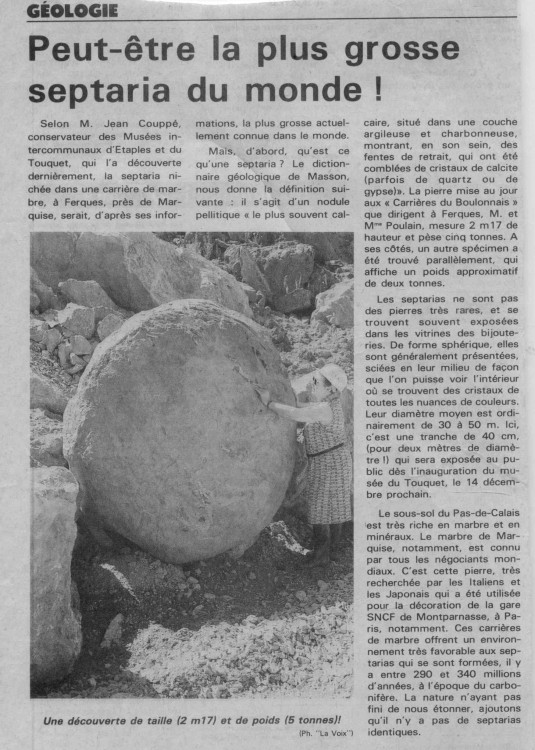Les tailles, comme les formes, sont très diverses, très variables. Depuis les boules géantes citées par André (des boules métriques sont connues dans la région sud de Sisteron) jusqu'à des billes, en passant par de belles "tommes"; de la boule parfaitement ronde, à des "boudins" plurimétriques, en passant par des "gâteaux pouding" de 60x120x20cm… Lorsque l'on a la chance de pouvoir étudier un gisement en assez bon état, on peut remarquer plusieurs "couches" (dépots) de septaria, les septatrias varient en taille, en forme et en contenu d'une couche à une autre, alors qu'ils sont assez homogènes dans une même couche…