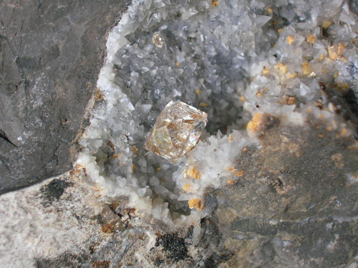 - quartz 15mm jaunâtre sur gangue de calcite.