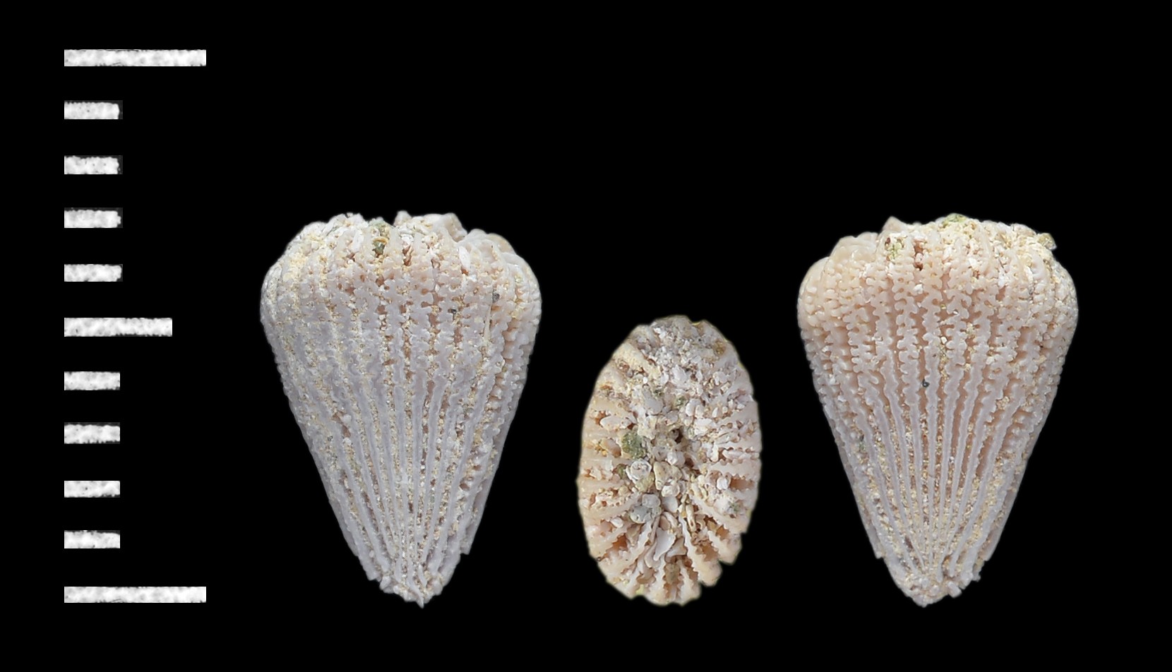 Ils mesurent environ 1.7 mm de long, ont une forme conique et des sortes de stries verticales. Pas d'ouverture dans la partie supérieure. Les stries (ou cloisons ?) se prolongent vers le haut à l'intérieur (comme on pourrait l'observer sur un polype de cnidaire).