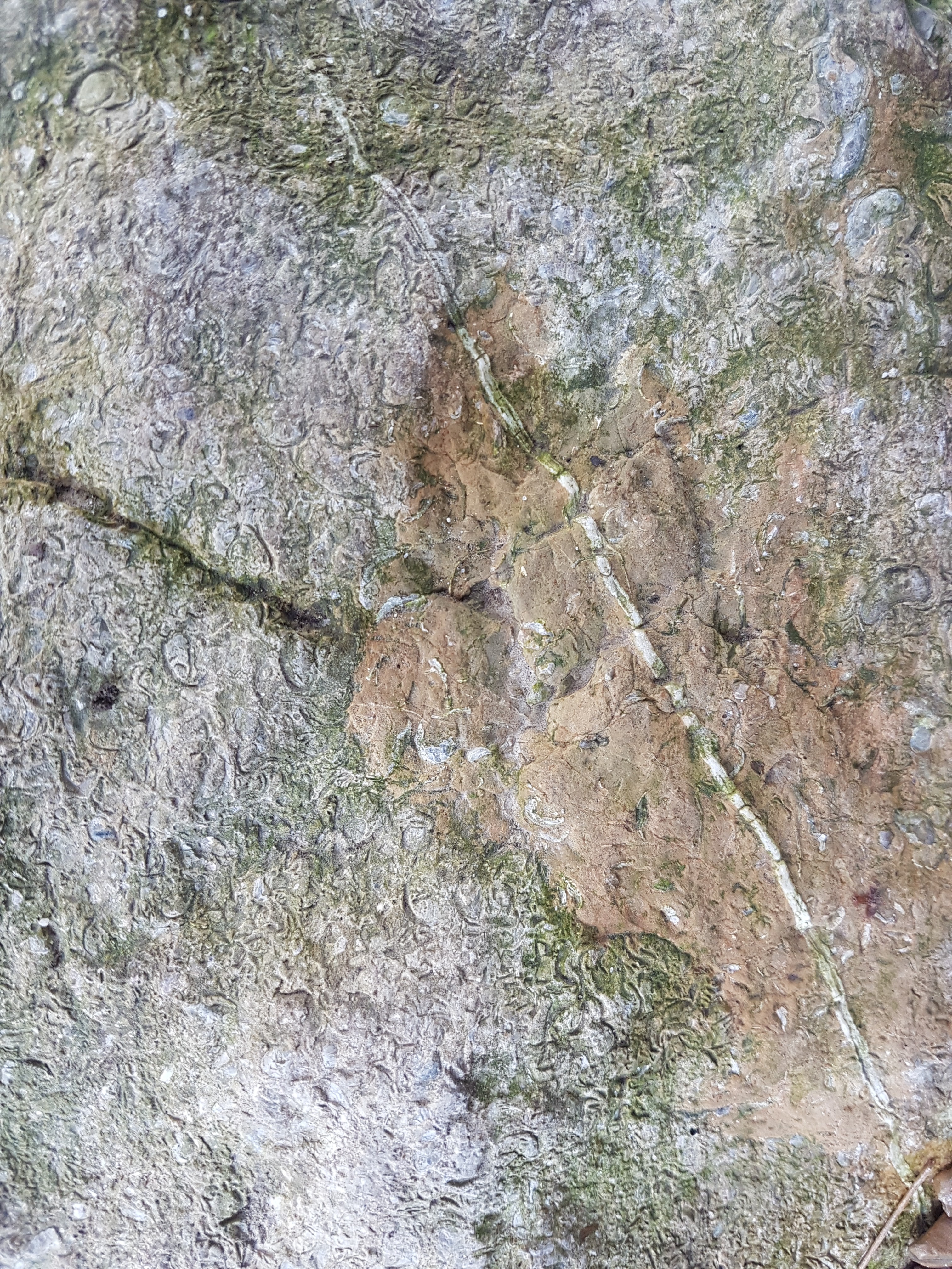 Sur cette photo on en voit une, elle semble parfois courbe, mais c'est peut étre juste une question d'intersection ente un plan et une surface irrégulière. Par contre on voit des petits décalages.  Finalement il faudrait en savoir plus. Mais sur une roche hors affleurements c'est un peu vain.