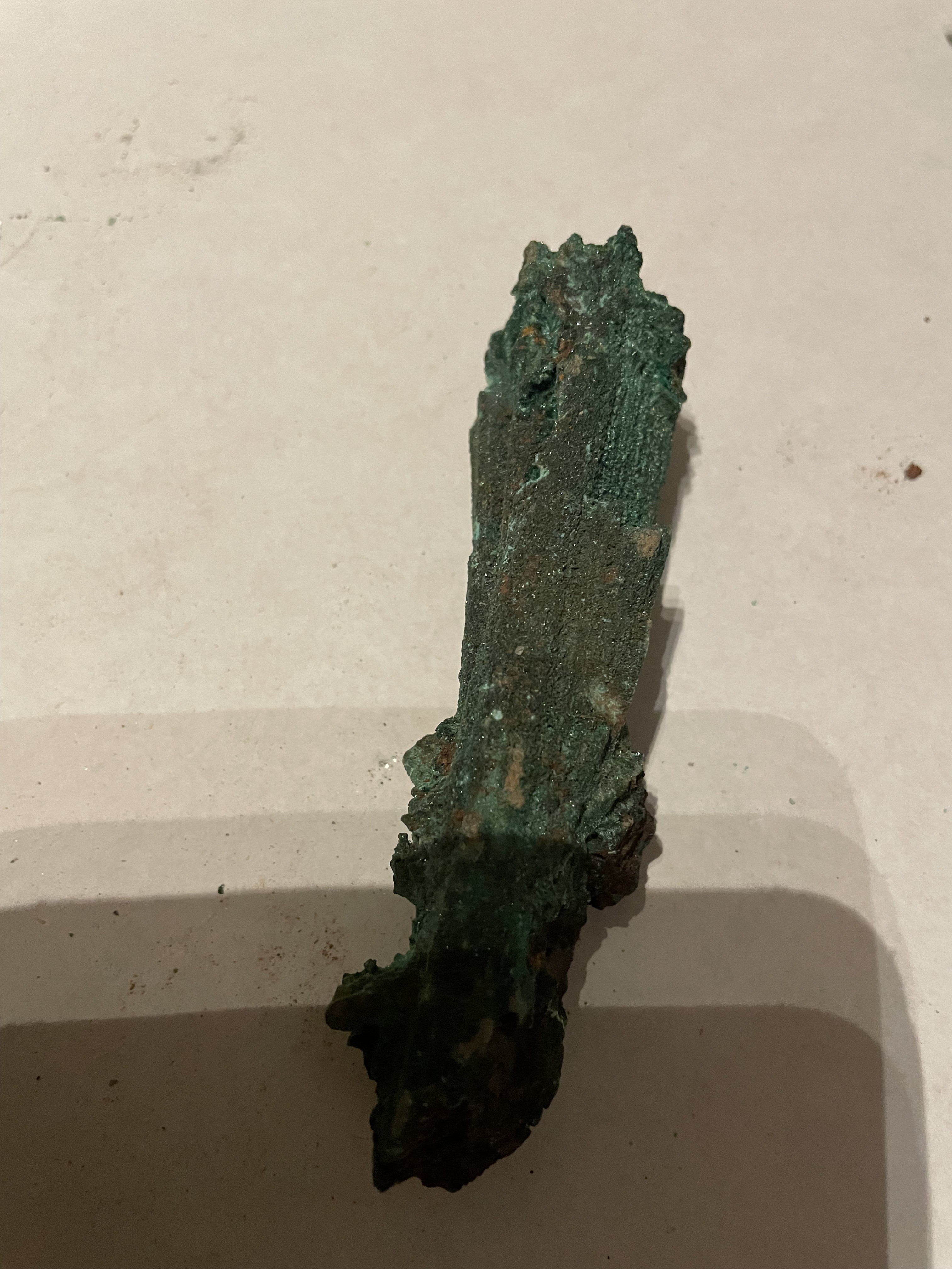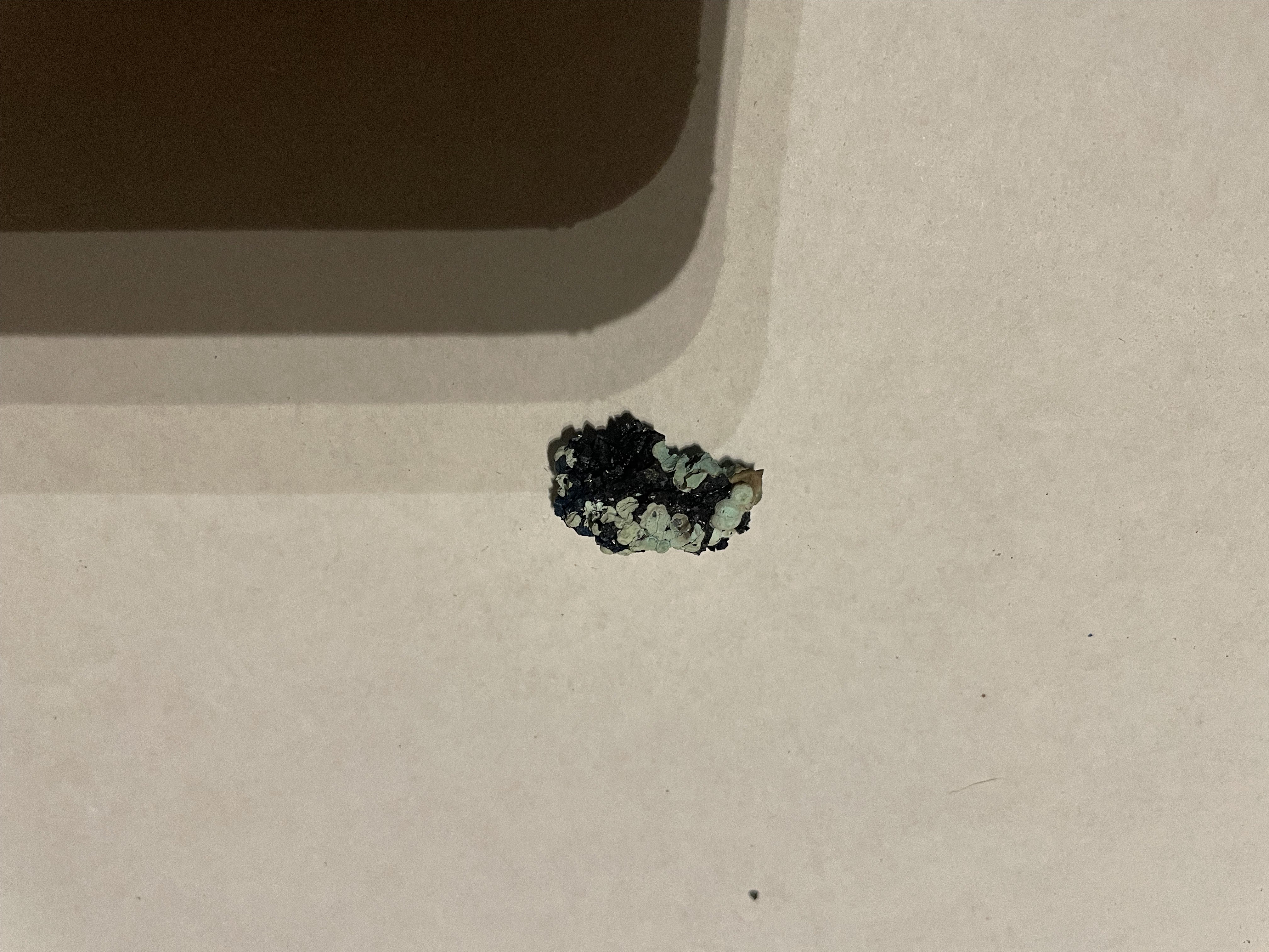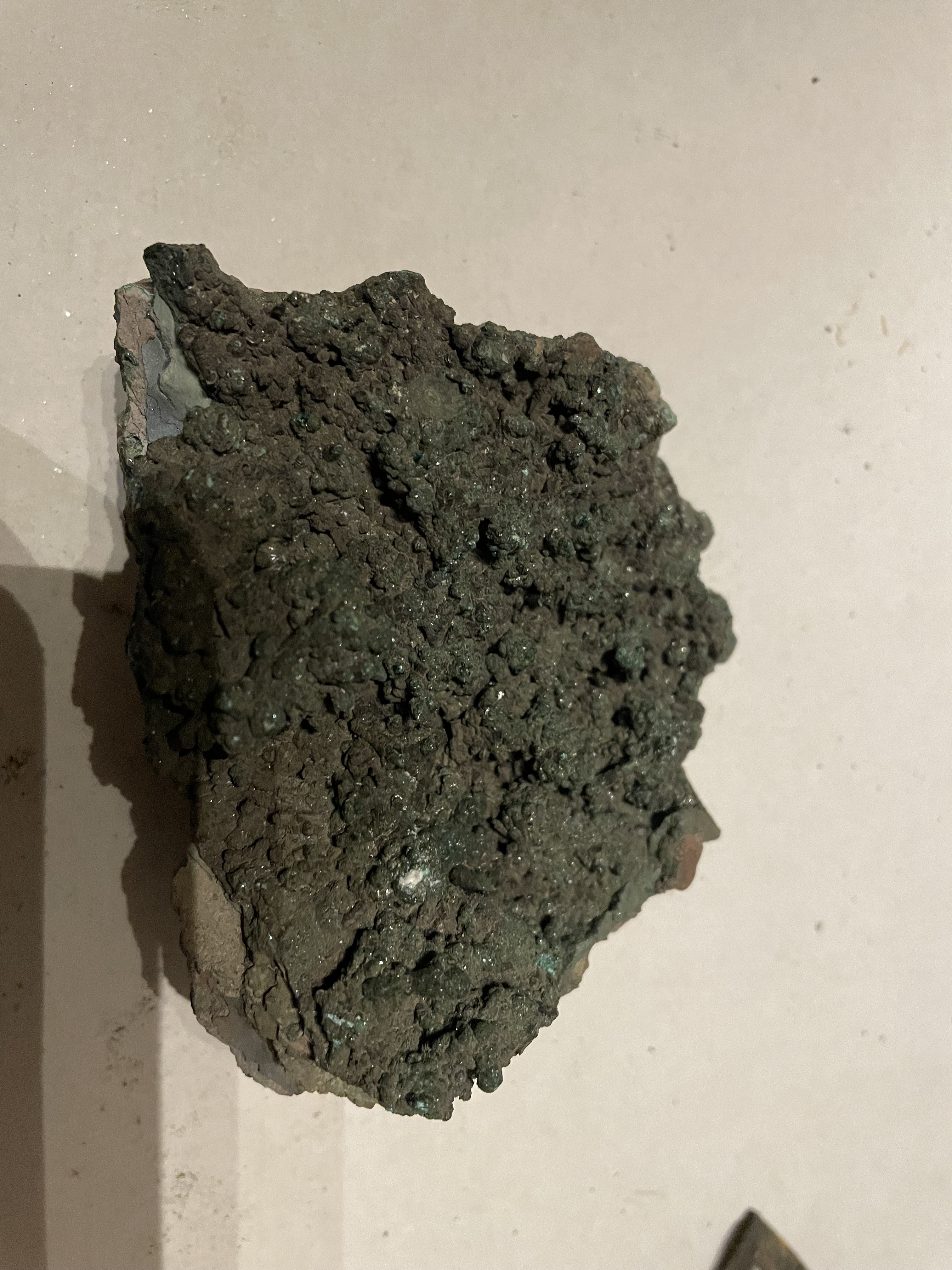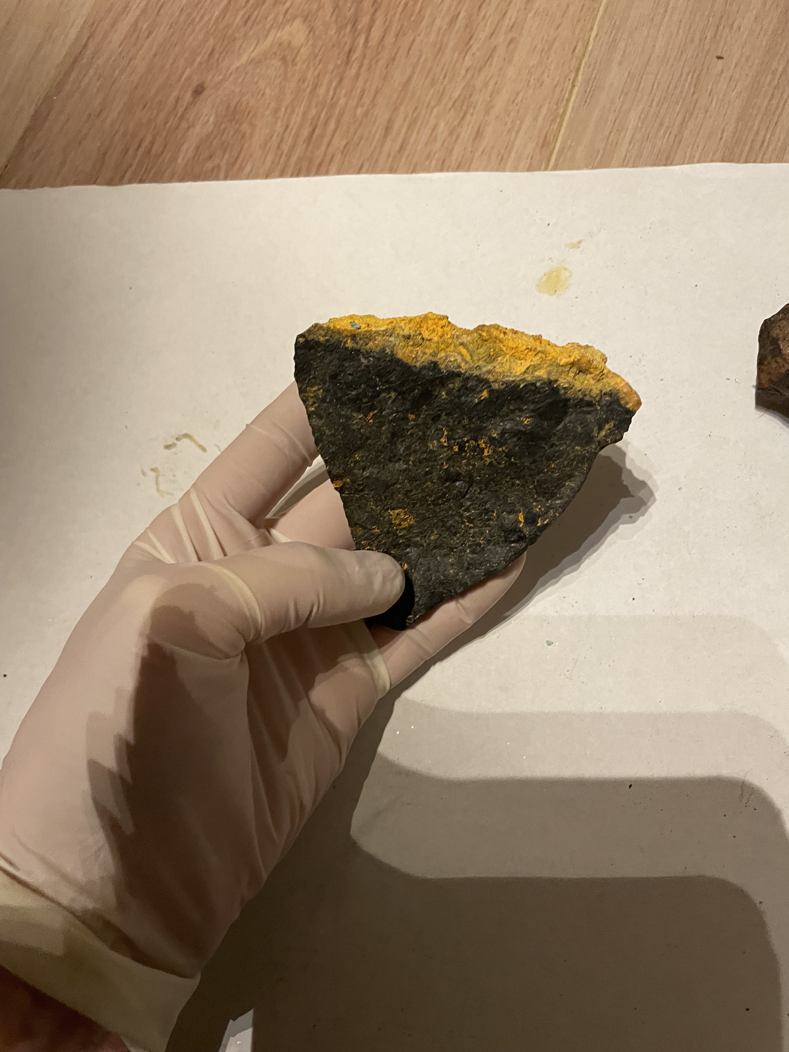 Le problème est que la vitrine de la Tobernite potentielle s'est complètement désagrégée et que j'ai eu des mini-morceaux de minerai partout lorsqu'elle est tombée de mes mains quand je l'ai prise. J'ai bien balayé et remis tous les morceaux que j'ai pu retrouver dans la vitrine (d'où les gants par précaution) mais j'espère que de ce côté je n'aurai pas de soucis. D'un autre côté il y a une seconde petite boite vitrine/plexi (également en mauvais état, que j'ai rafistolé avec du papier collant pour boucher les ouvertures) avec dedans un minéral bleuté foncé (crocidolite possible?) dont je ne sais que faire. je vais tenter de prendre de meilleures photos dès que je retrouve des gants et un masque 🙂