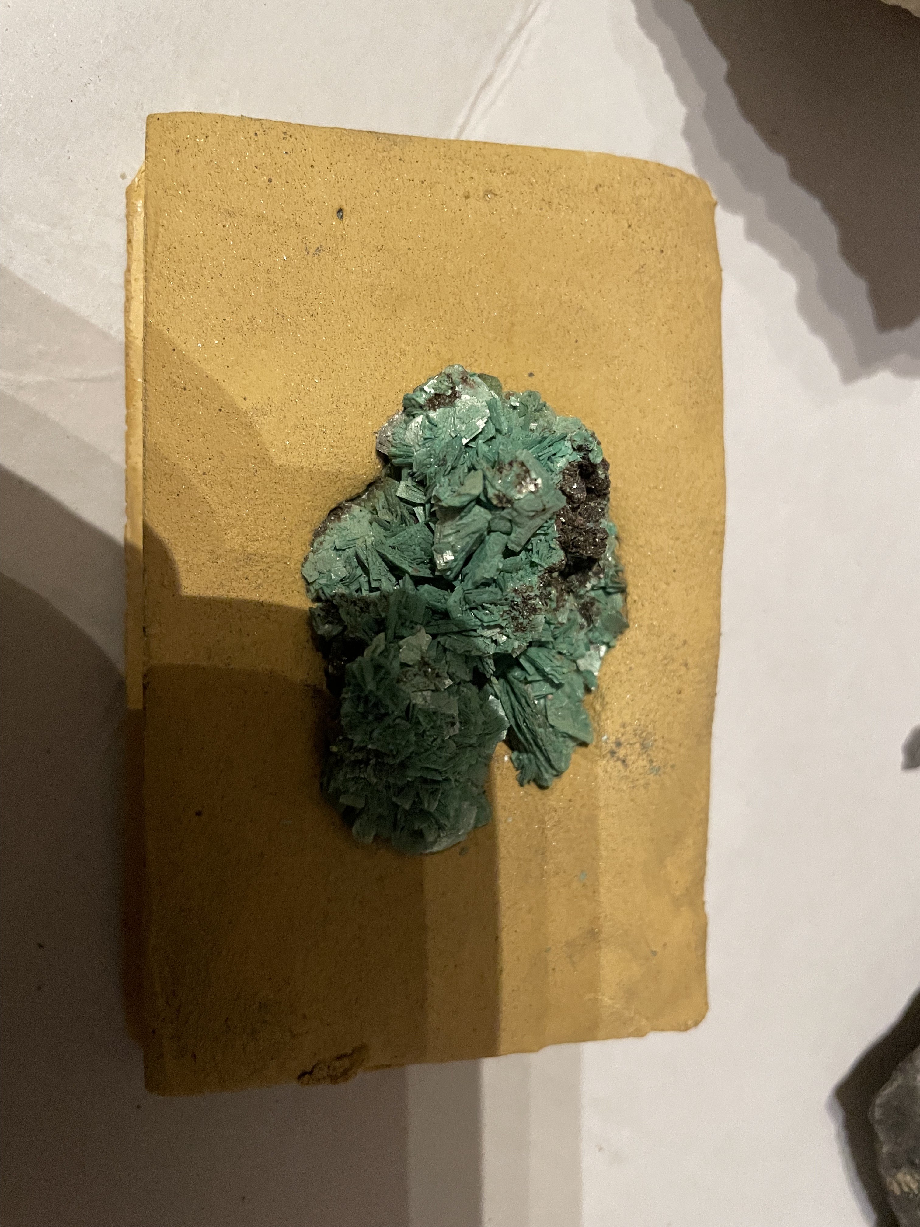 Oui, on est d'accord sur celle-là: il y a de fortes chances pour que ce soit une torbernite. Pas congolaise en tout cas. Origine France (Margabal, Aveyron) possible mais ne sera pas certaine. Ce qui ne change rien aux précautions à prendre en présence de ce type de minéral.