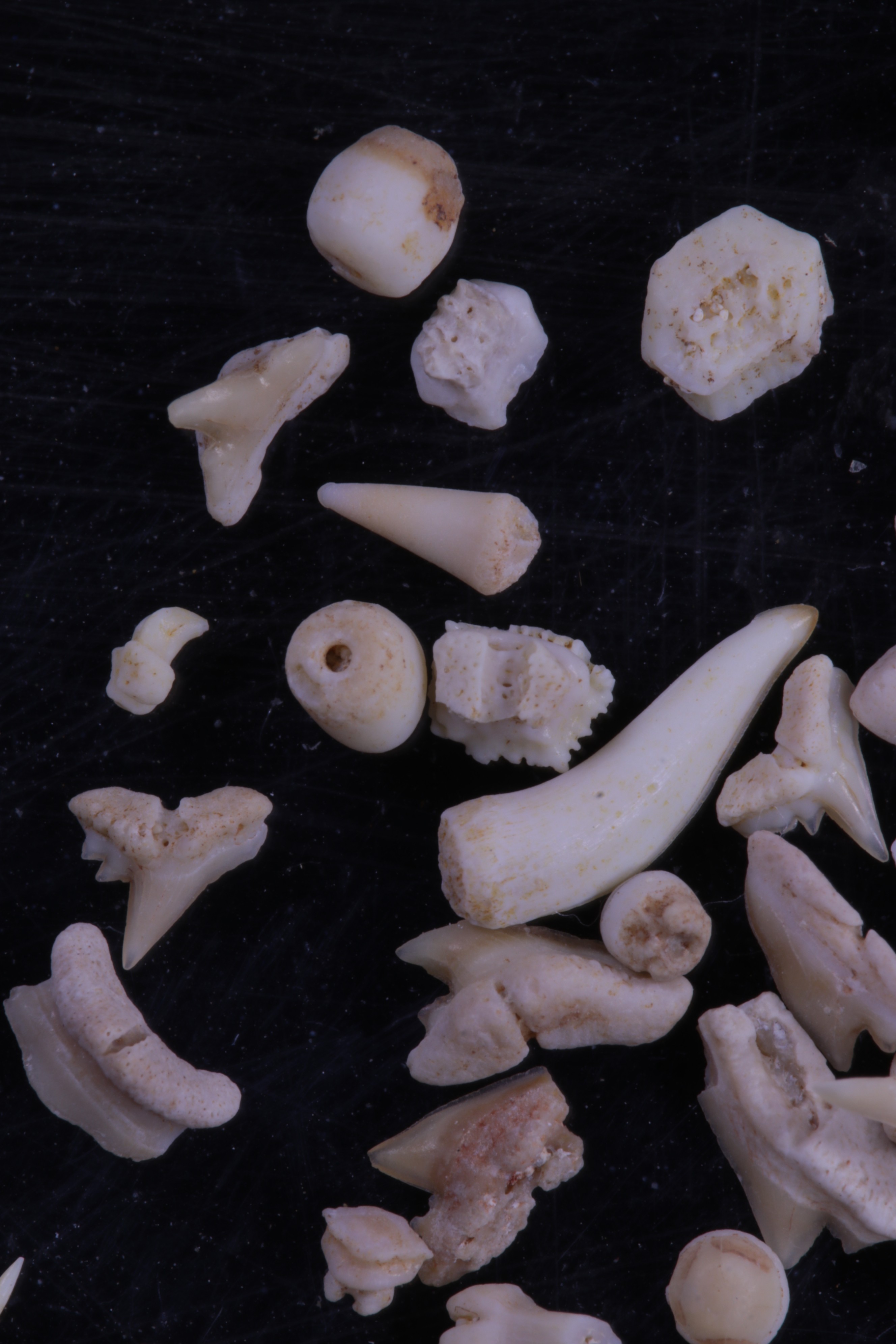 Micro vertébrés de l'Yprésien triés, mais non classées, pris en photos directement sous l'objectif binoculaire avec un APN compact Sony