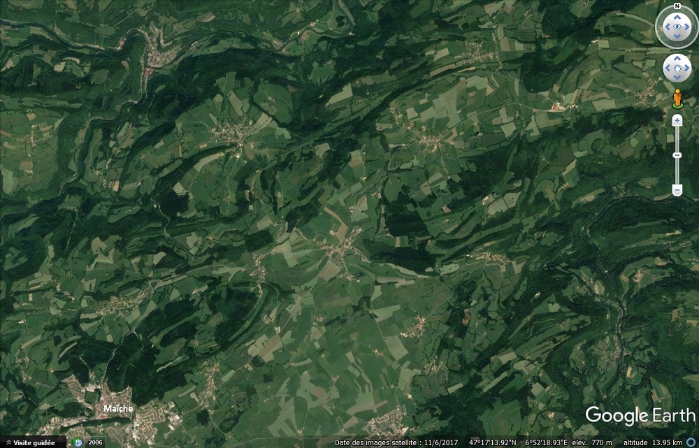 Comme dans le Jura, contraste champs (à pertes de vue !) vs forêt et lacs glaciaires. En zoomant un peu :