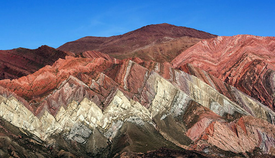 "En el Dominio del Altiplano Oriental, la actividad inversa de las fallas NO-SE, han originado repeticiones tectónicas, cuyos niveles de despegue son más superficiales al este. (Rildo, 2010), en tal sentido existen evidencias en las Formaciones del jurásico-cretáceo superior (Formación Muni, Huancané y Vilquechico) las fajas plegadas asociadas a fallas inversas de alto ángulo, exponiendo estas intercalaciones de un aspecto abigarrado que resulta de la interestratificación de pelitas rojas (dominantes) y de pelitas verdosas yesíferas. El clima frio de ambiente glaciar y el grado de buzamiento de la estratificación influyen en la presentación de estos multicolores. El análisis estratigráfico y sedimentológico indica que las montañas multicolores se muestran en la Formación Vilquechico de aspecto abigarrado de un ambiente marino poco profundo. Las coloraciones dependen si se formaron en ambientes reductores (verde blanquecino, verde oscuro, verde gris) o ambientes oxidados (amarillo, rojo, marrón rojizo)."