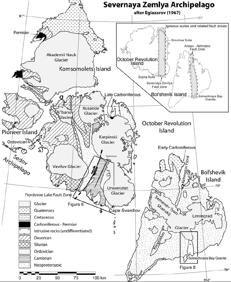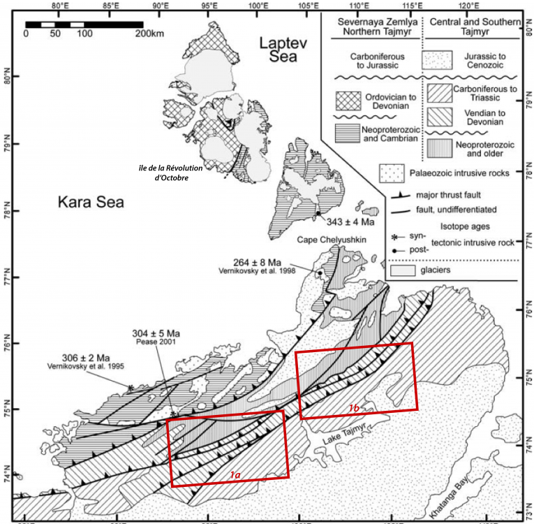 2. Au large, la Terre du Nord (Severnaïa Zemlia), un archipel de la marge continentale sibérienne. Sous une couverture glaciaire, la plus grande île laisse entrevoir son intimité géologique :