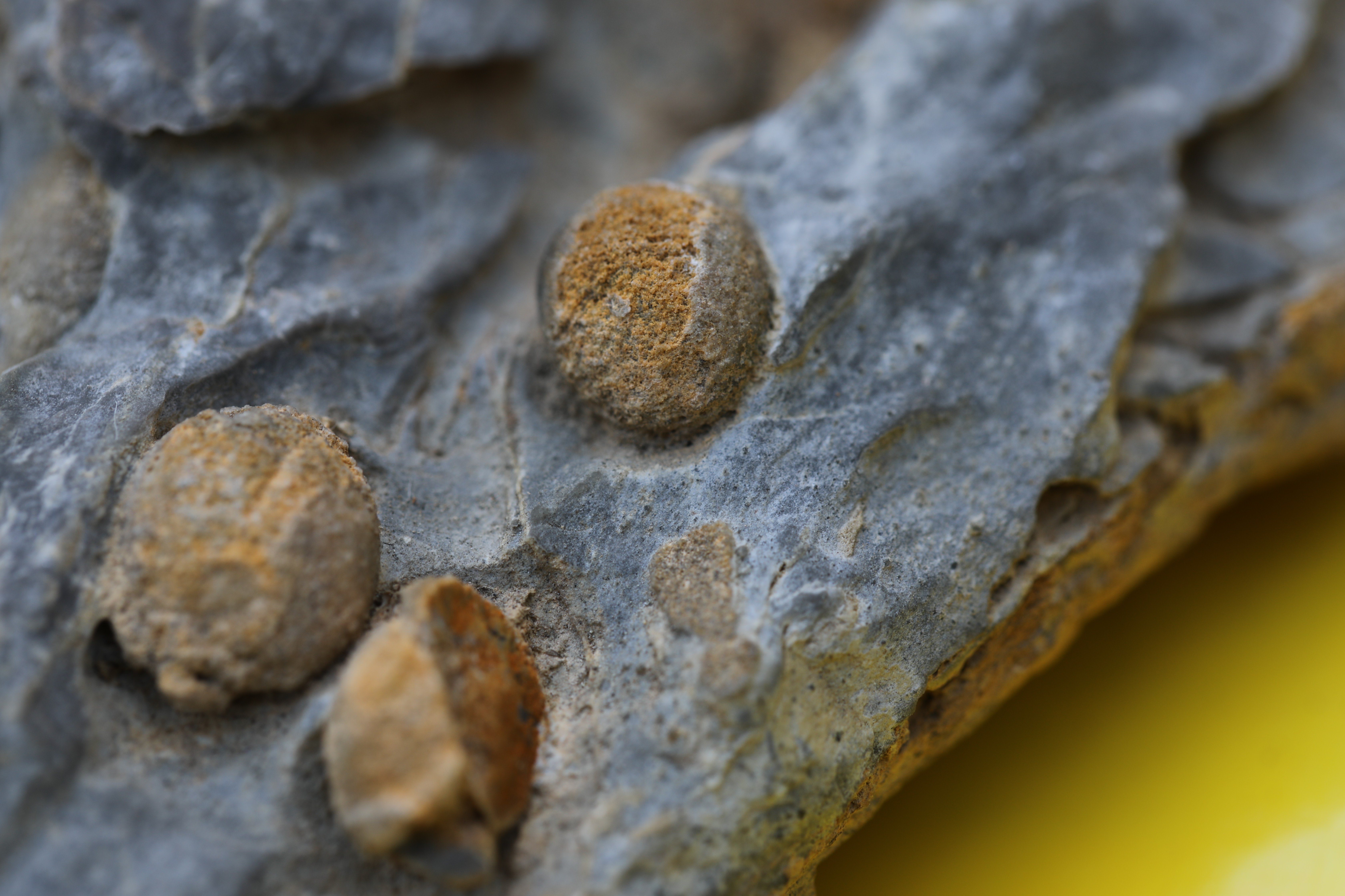 Coté "Fossile": Merci, Gratophil, pour tes suggestions. A y regarder de plus près, je ne vois aucune trace de symétrie, laissant supposer que cela pourrait avoir une origine animale, en particulier chez les mollusques, ou Brachiopodes. Les nodules semblent parfaitement sphériques, légèrement ovoïdes, légèrement rugueux avec une cuticule?/coquille? d' 1/4 de mm d'épaisseur (2ème photo en haut).