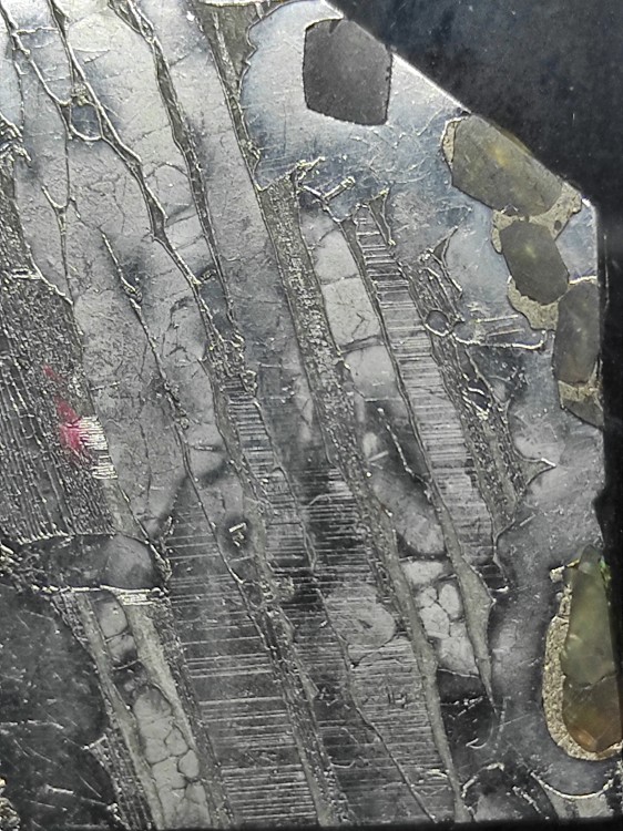 J'ai cette Seymchan (170g, 127 X 70 X 6 mm) en collection depuis 2007, jamais vu le moindre point d'oxydation apparaitre dessus. Elle est polie miroir. Dommage que l'épaisseur importante de cette tranche ne permette pas d'apprécier la translucidité des cristaux d'olivine verts-jaune, sinon par quelques reflets internes :