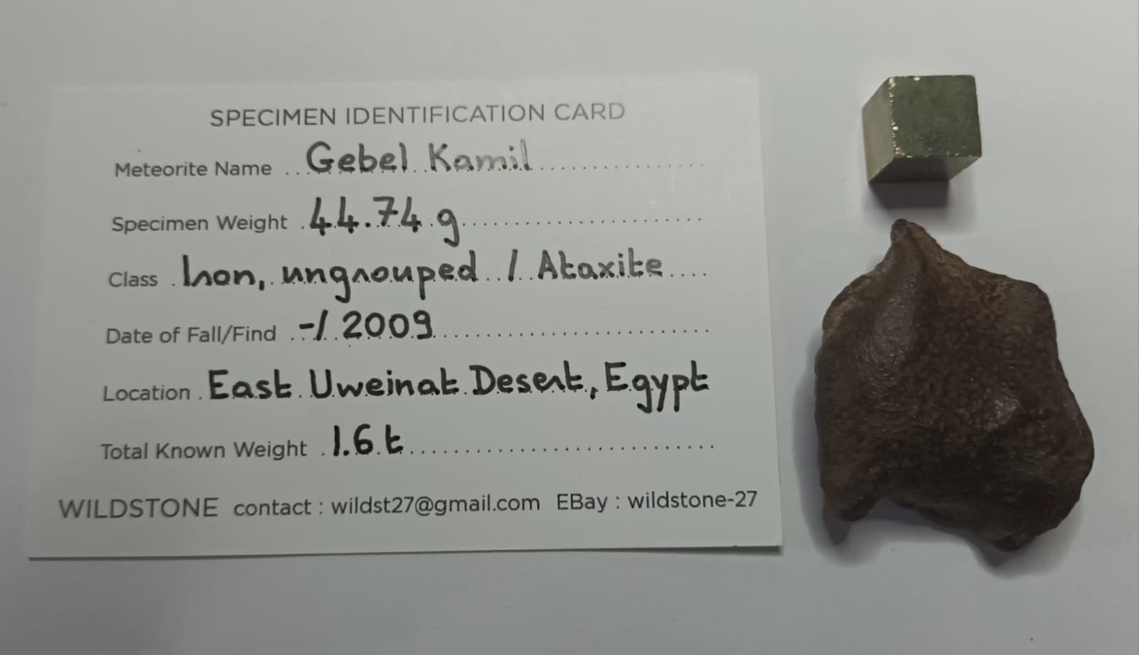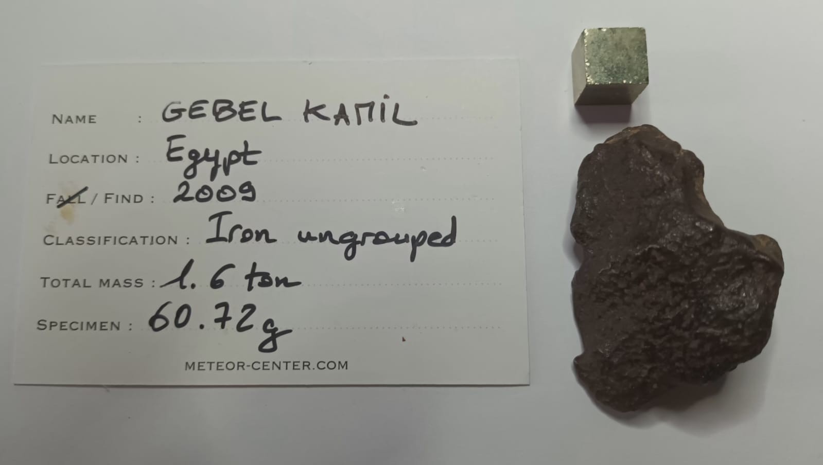 Découverte en février 2019 dans le désert Egyptien par une équipe de géophysiciens Italiens/Egyptiens autour du cratère d’impact de 45m de diamètre de Kamil. Ce cratère fut identifié par V. De Michele, conservateur du Musée d’Histoire Naturelle de Milan en Italie. La campagne géophysique fut menée dans le cadre de « 2009 année de coopération Italiano-Egyptienne dans les Sciences et Technologies ». Près de 1.6T de fragments ont été récoltés (dont un de 83kg couvert de regmaglytes) lors de campagnes de 2009 et 2010. Du fait de la stricte législation concernant l’exportation de ce type d’objets hors d’Egypte, peu de spécimens ne réapparaitront sur le marché jusqu’à 2023 ou un lot conséquent sera proposé à Tucson.