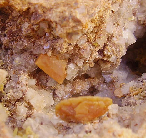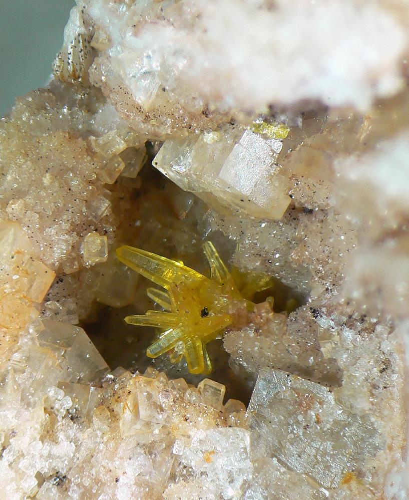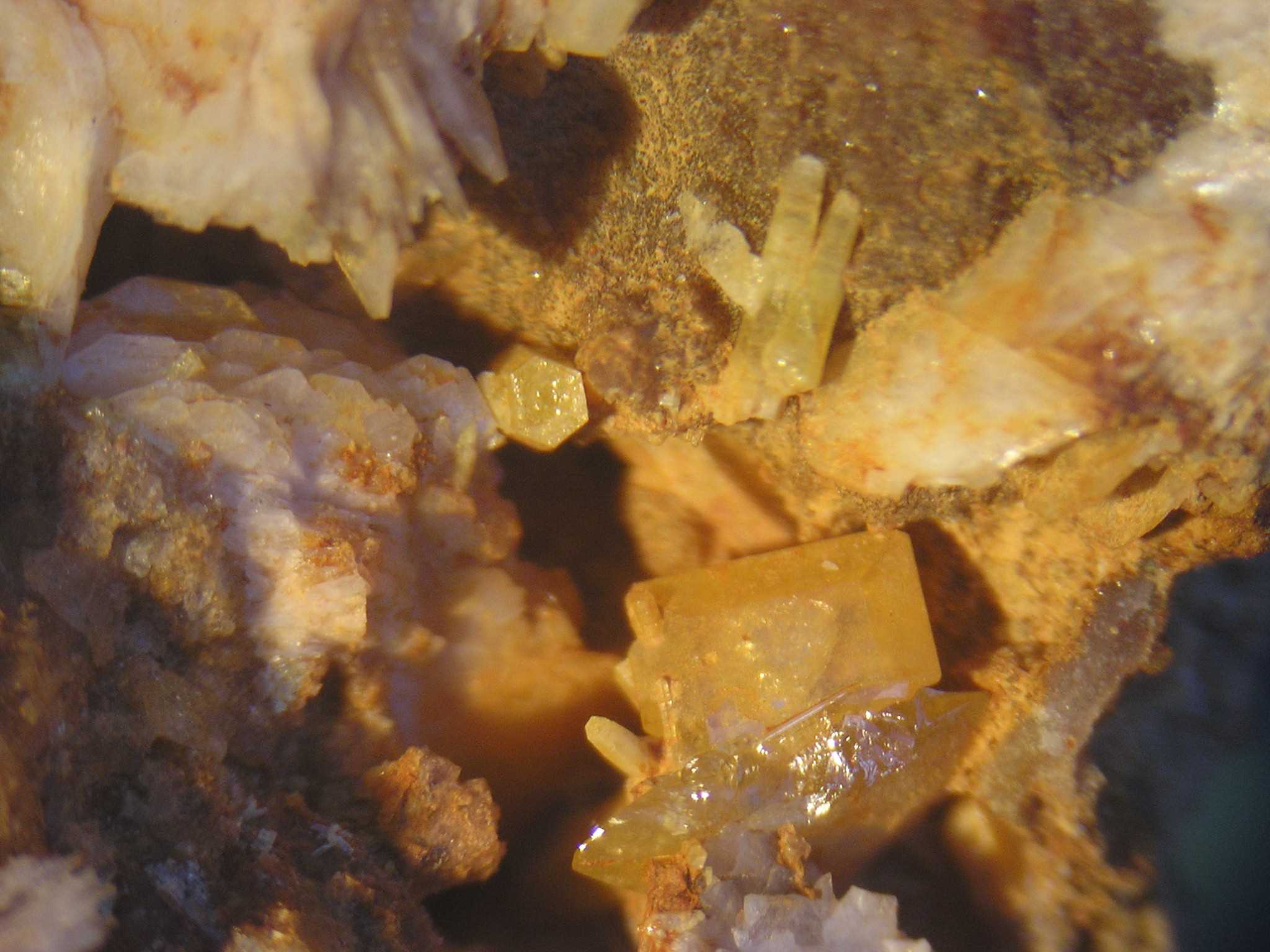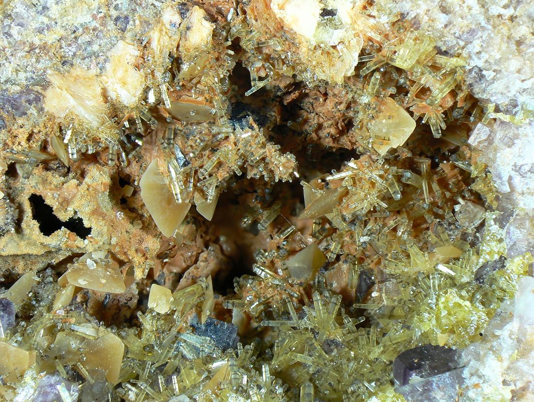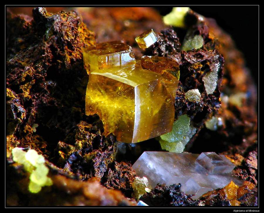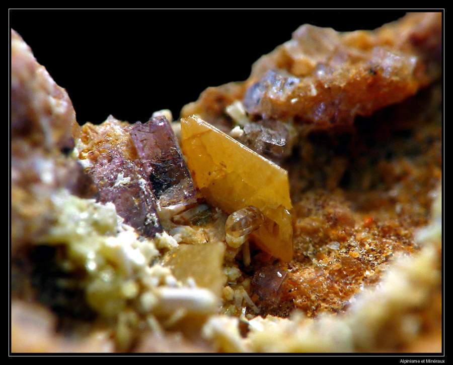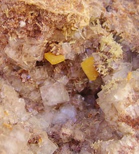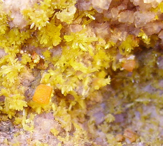 association wulfénite / mimétite / fluo, longueur de la géode : 15 mm.