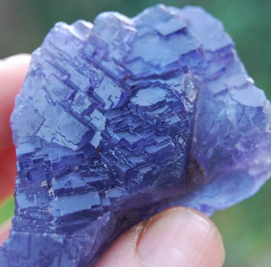 Sur toute la partie fluorée du coins, les fluos qui ressemblent a ta bleue, se sont formées dans un calcaire tres geodesique (avec pleins de cavités de toutes tailles quoi !). Elles ont bien pu se developper. C'est pour cela que l'on voit si bien cette forme en escalier (figure de Haüy) et qu'elle ont les faces si nettes.