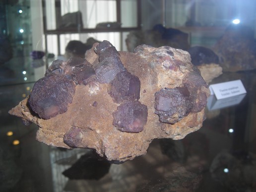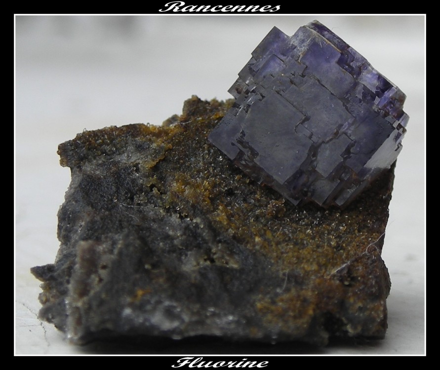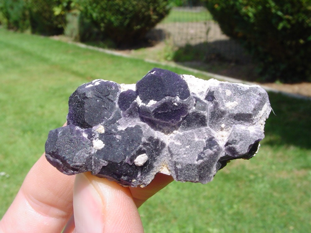 Ensuite, un cristal isolé sur gangue de jolie couleur violette. L'aspet granuleur n'ets pas du a une dissolution superficielle, mais pas la cristallisation elle meme (millions d'arretes de mini-cristaux)