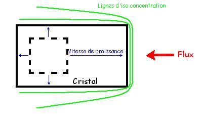 Le fluide se déplaçant, il va ramener des éléments au contact du cristal qui va les capter et ainsi grandir. Et c’est ici que cela devient intéressant, le fluide se déplace dans un certain sens et va ramener plus d'éléments au niveau de la face du cristal qui est face au flux (aouch un face à face), celle-ci aura ainsi accès à plus d’éléments (lignes d'iso-concentrations plus serrées) et va donc grandir plus vite. On obtient ainsi un cristal au faciès non plus cubique mais « étiré ».