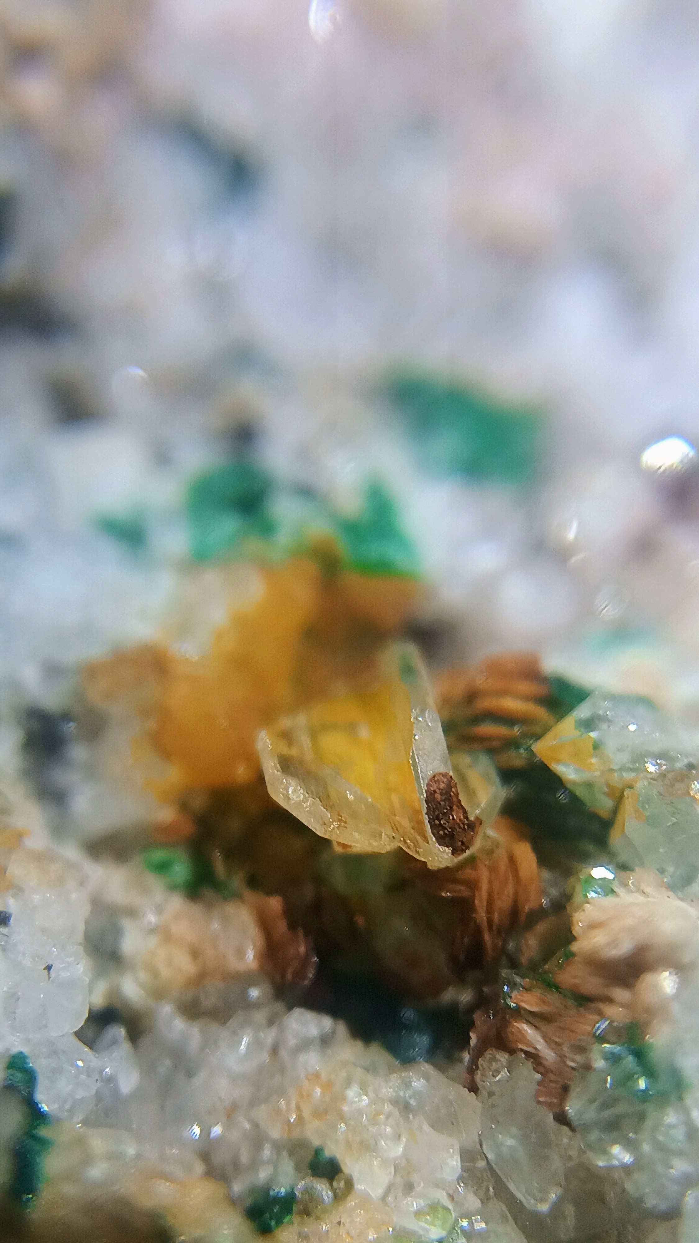 Sur le coup j'ai cru à un quartz, mais ils sont tous accolés et forment bien leur pointe, alors que celui-ci suit une toute autre logique étendue sur eux. Ça n'a pas le même éclat. Pas du tout convaincu pour le quartz.