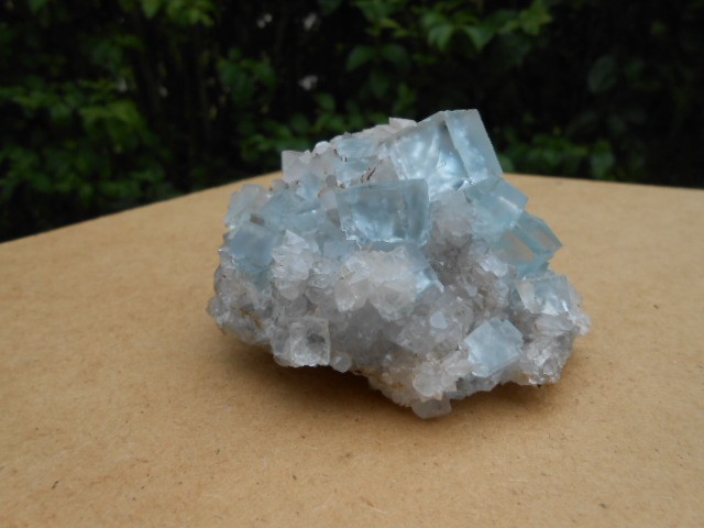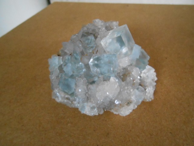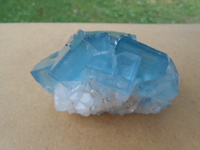 je poste cette fluorine qui est dans ma vitrine depuis des année,vitrine exposée dans le salon,effectivement certaines de mes fluos ont perdues le bleu d'origine comme celle ci . Deux photos en exterieur et 2 en interieur.La provenance de la fluo c'est toujours la même mine voir photo.