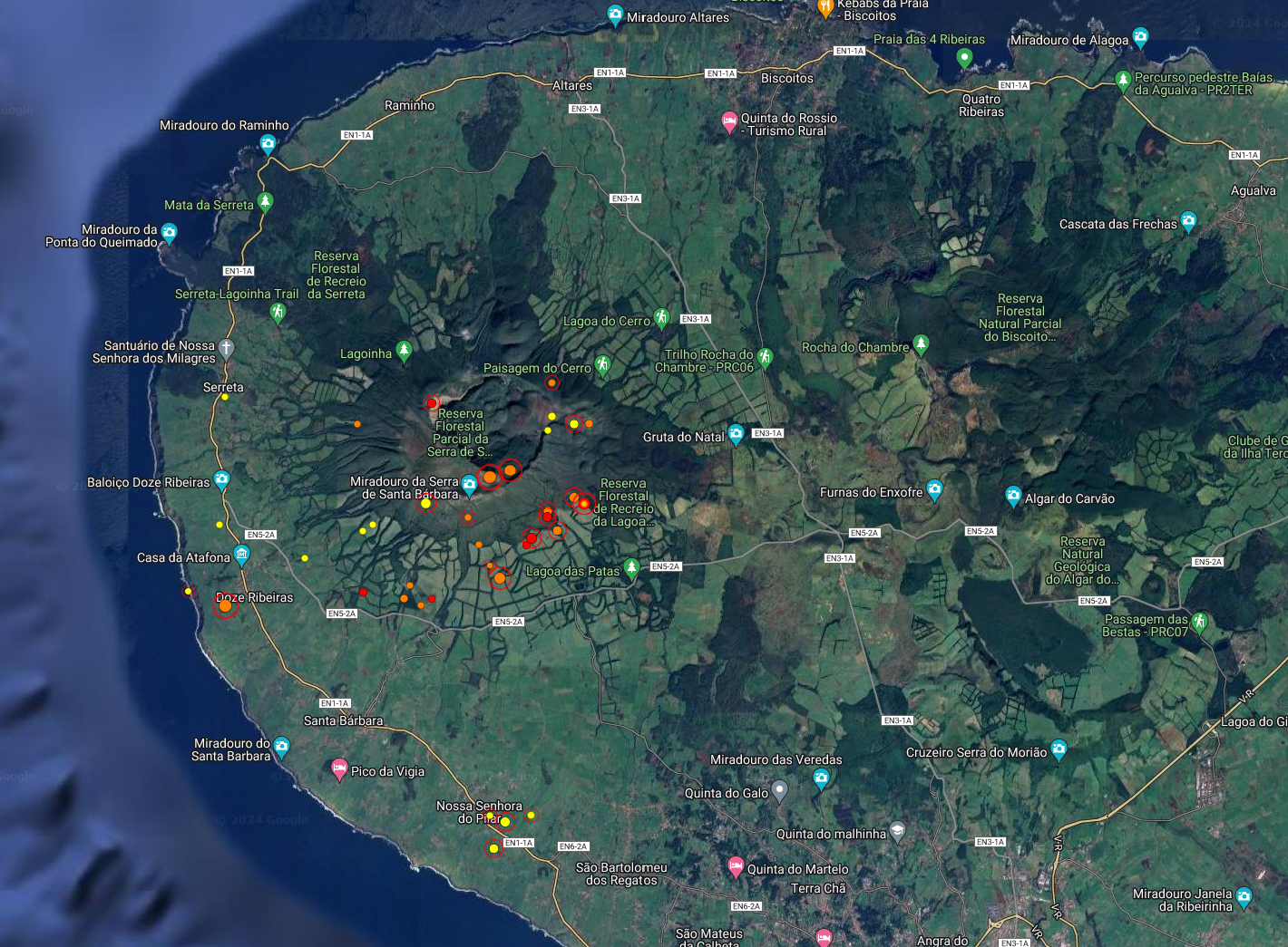 Selon un article de "Portugal News", ça bouge aux Açores sur l'île de Terceira  ... depuis mars déjà et le niveau vient d'être relevé à V3 : ça correspond à une confirmation d'intrusion magmatique profonde (si j'ai tout compris)