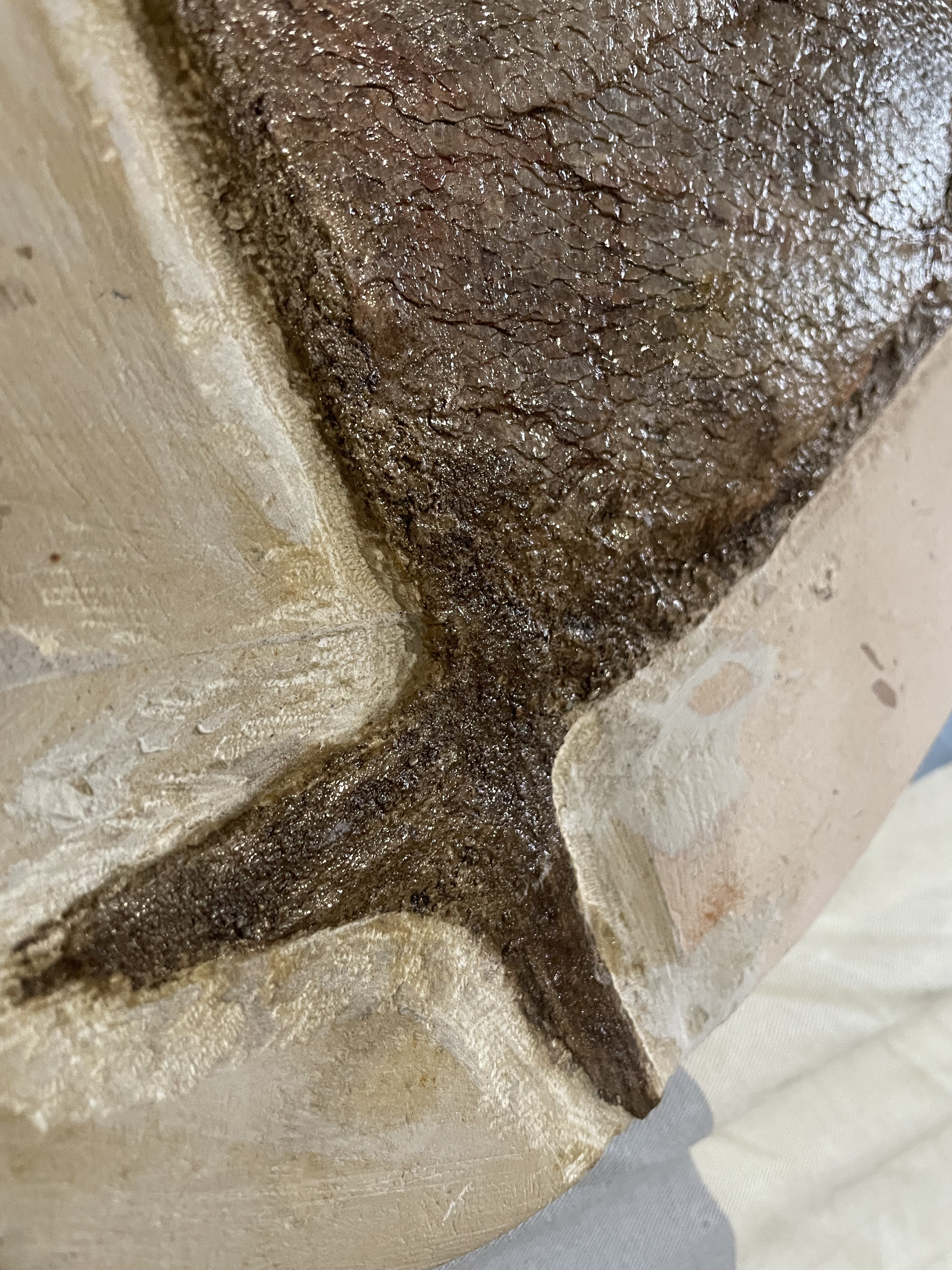 Voici un poisson (22cm) venant du turonien de Goulmima que je n’arrive absolument pas à identifier, en cherchant « goulmima fossil fish » je n’ai pas trouvé grand chose, pourtant un poisson discoïde ça ne passe pas inaperçu ! Mais je suis tombé sur une publication comme quoi l’Araripichtys est aussi présent à Goulmima ! Pourtant ce spécimen ne ressemble pas du tout mon autre Araripichthys