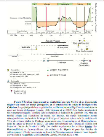 Je mets des extrait de la thèse : "Par exemple, l’extinction de masse qui a eu lieu à la transition Ordovicien/Silurien aurait entraîné une forte diminution de la proportion d’organismes précipitant de l’aragonite en faveur de ceux précipitant de la calcite, ce qui semble d’ailleurs être corrélé avec l’apparition des Octocoralliaires calcifiants (Figure 5) .L’extinction de masse à la transition Permien/Trias serait également associée à une augmentation de la diversité des taxons précipitant de l’aragonite, et correspond à la divergence des Scléractiniaires en clades robustes et complexes."