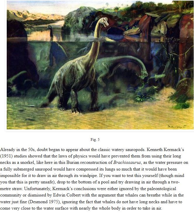 Geopas, même en mettant de côté le facteur de la pression si tu regardes bien l'image, si les animaux se mettent debout sur leurs pattes arrières, la totalité du cou sort de l'eau et les poumons sont au niveau de la surface de l'eau, tout est cohérent. Et même si les animaux devaient aller encore plus profond et que l'on devait admettre une quelconque difficulté respiratoire, se qui reste à prouver, ils n'auraient qu'à exercer une simple petite extension des jambes pour remonter, inspirer, expirer et redescendre chercher une bonne bouchée de crudités. Tout me semble cohérent.