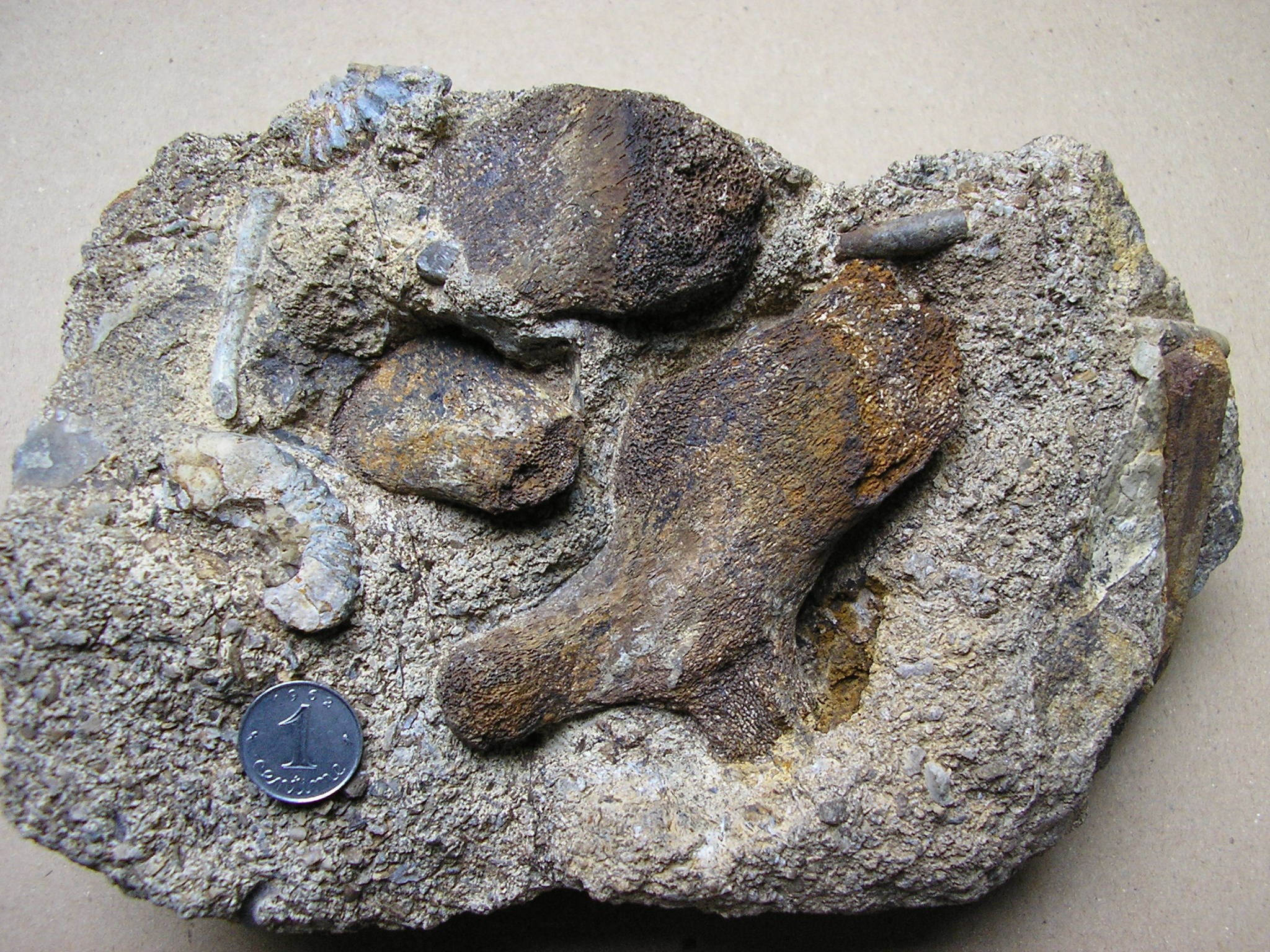 "Pliosaure ou ichthyosaure?" -> c'est vrai que les 2 os de la photo du bas font bien penser à des  phalanges d'une palette natatoire d'Ichtyosaure (ainsi que la coupe en forme de sablier de la vertèbre)