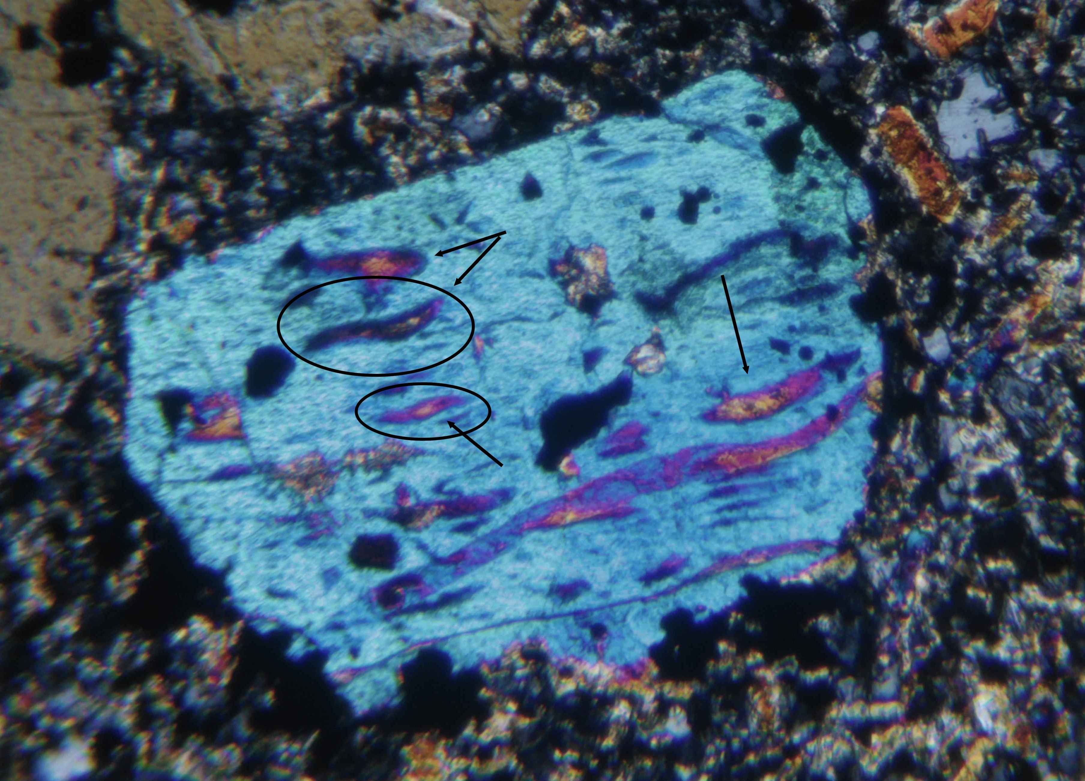 Les inclusions un peu lobées, comme celle qui est au centre du phénocristal sur la première photo, sont souvent des inclusions de magma piégées lors de la croissance, puis recristallisées comme la mésostase de la lave.