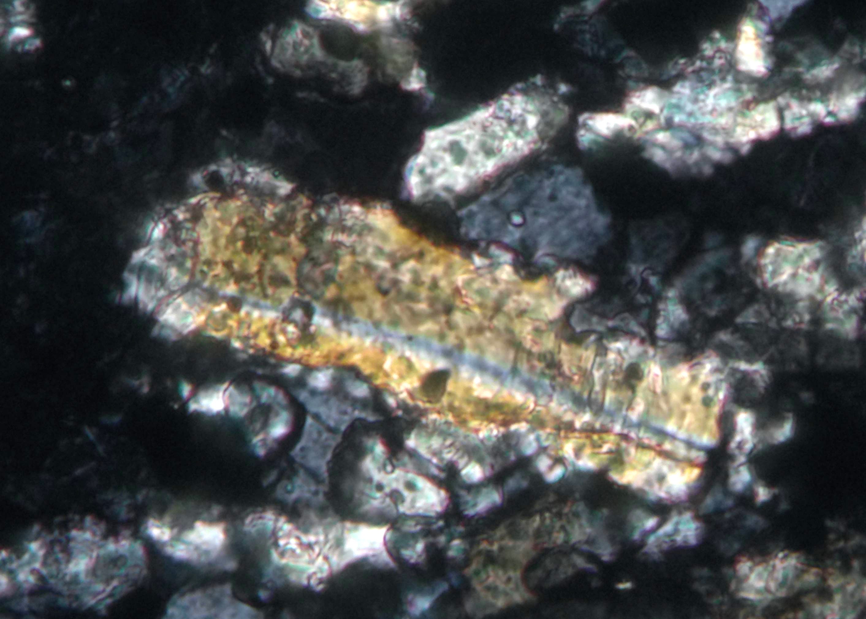 Fayalite est une piste, mais on voit quand même des macles sur les dernières vues, et des canaux pleins d'inclusions dans les lattes devraient être plus symétriques que ça, il me semble.