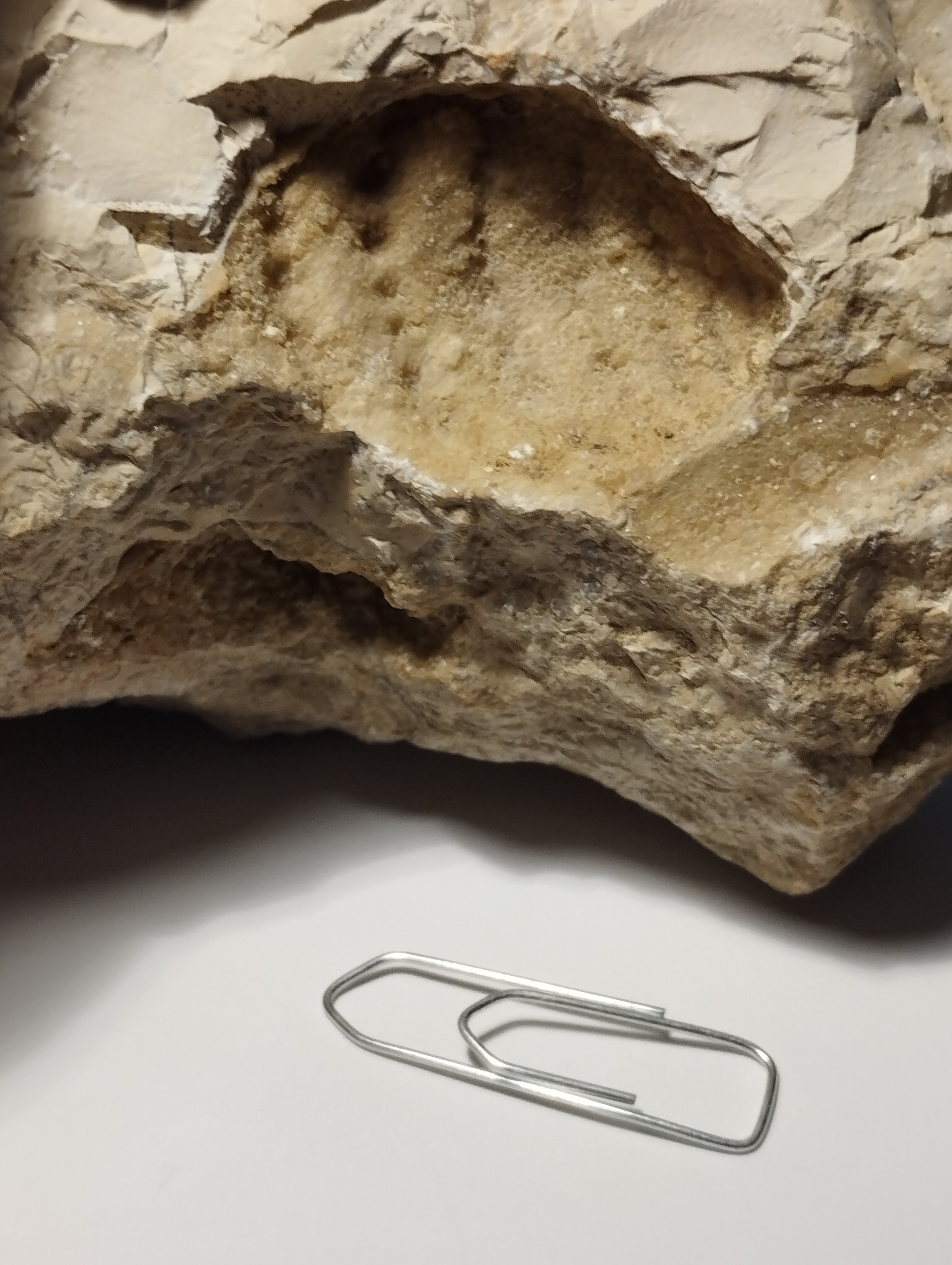 J'ai trouvé un petit bloc de calcaire avec ce qui ressemble à une empreinte de fossile... On voit bien plusieurs sillons qui fait penser à un coquillage, avec des petits trous à intervalles réguliers.
