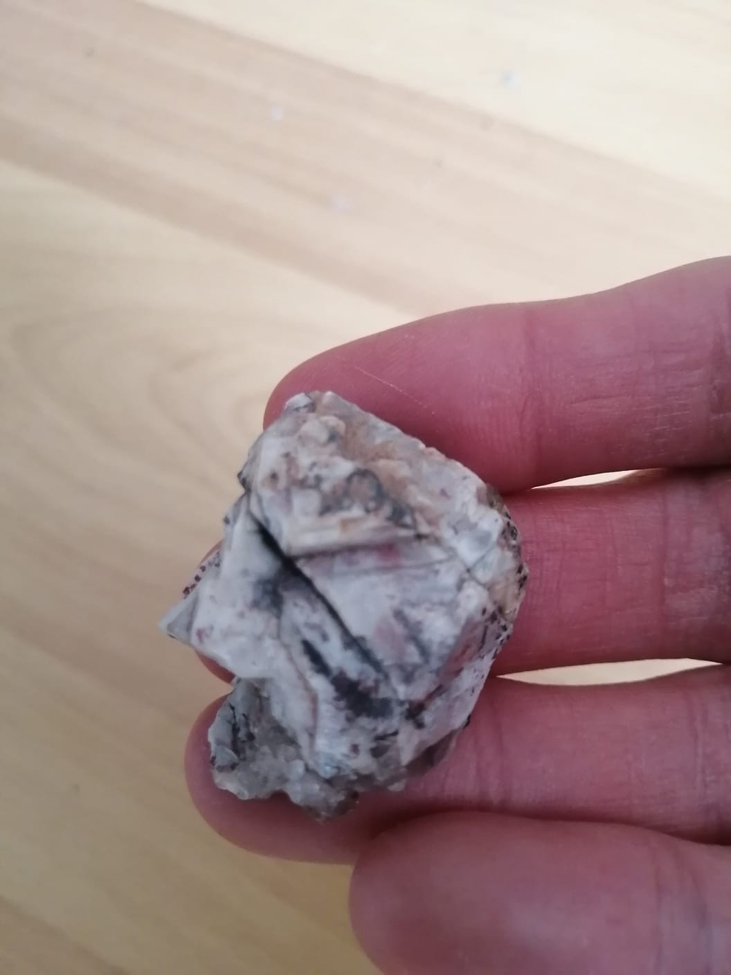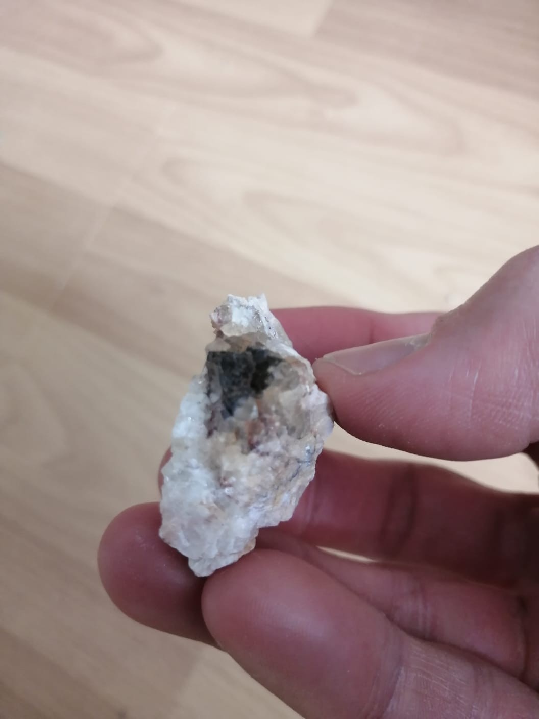 A présent, la rose et grise. Densité 3.6-4.2. Dureté 5.5-6 pour la partie rose, supérieure à 6 pour la partie grise. Trace : blanche pour la partie rose, grise pour la partie grise. Pegmatite et galène ?