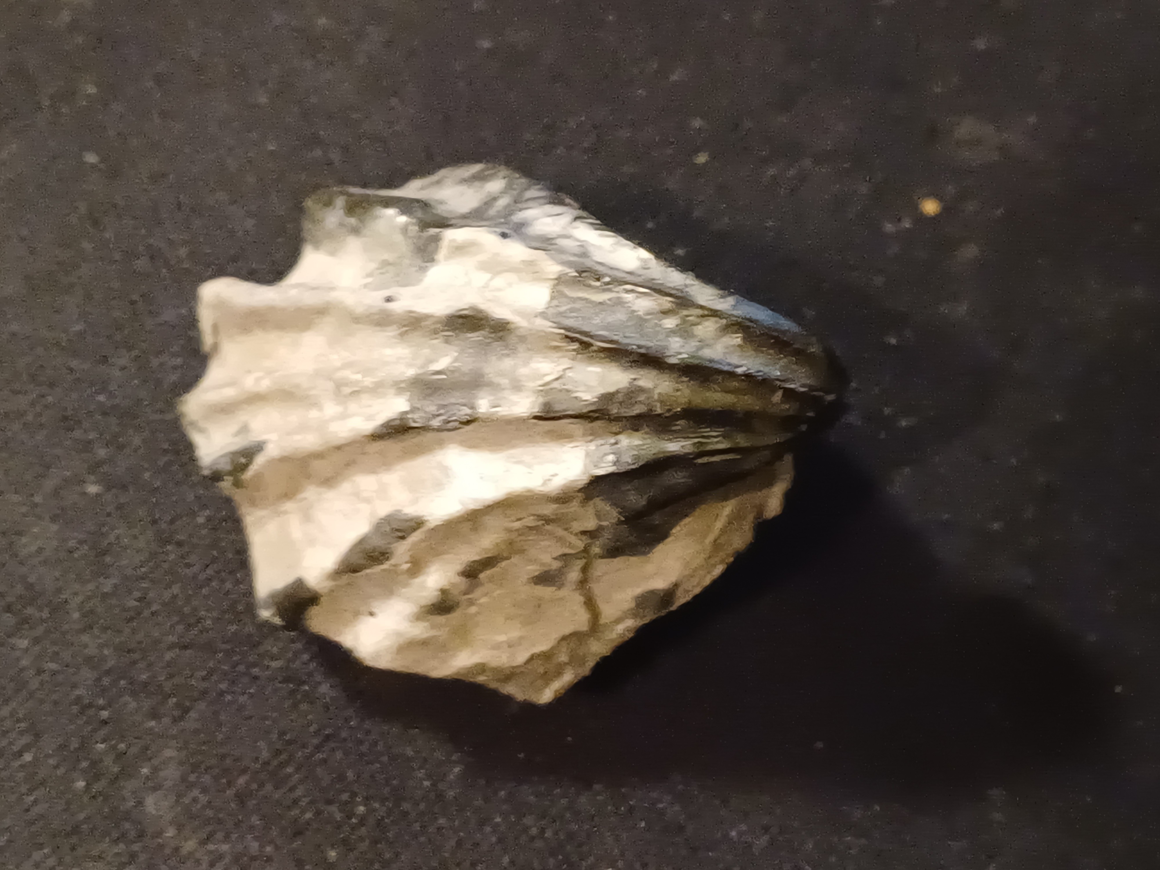 Et fait référence à cette phrase : "Quant au fossile en fer de lance à côté, la structure de surface granuleuse et le bord finement cranté, on pourrait penser à du crustacé, sans conviction, parce quelle partie ce serait ? ou bien un aiguillon de chimère ? Une énigme comme je les aime, même si on n'a pas la réponse !"