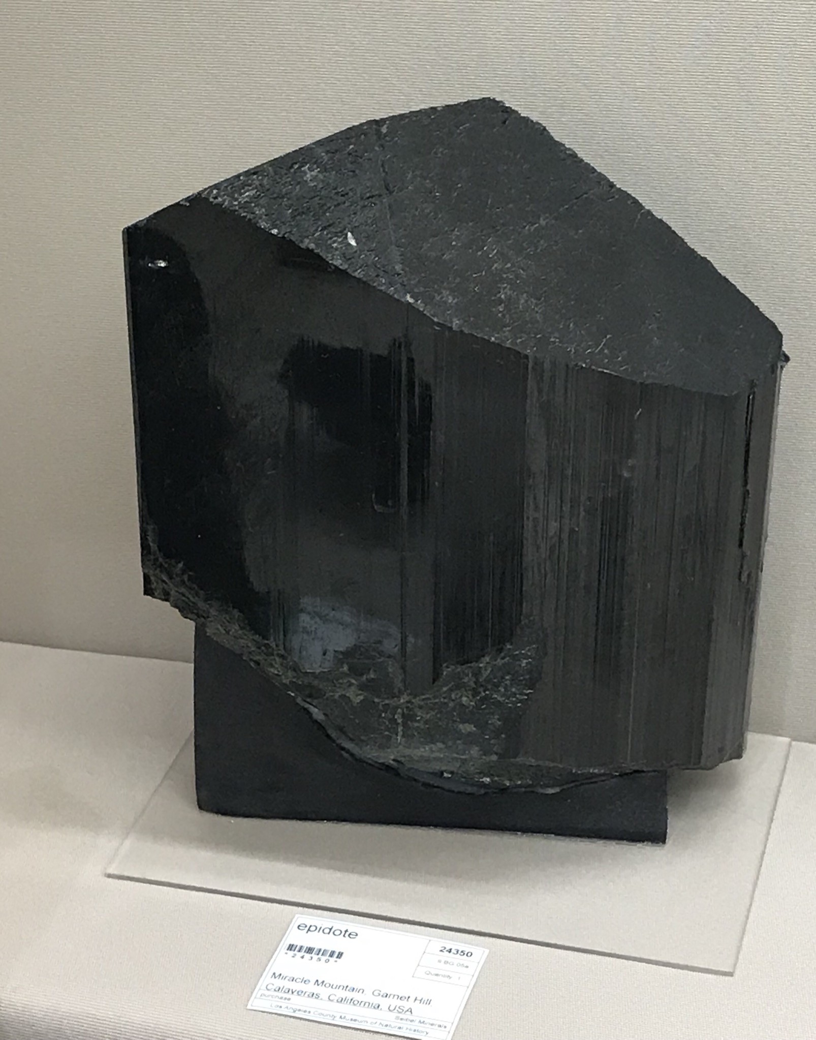Variation sur le même thème: une macle en miroir sur un cristal de Clinozoïsite provenant du Cerro San Cristobal, San Vicente de Canete (Pérou). Habitus très fréquent sur cette localité.
